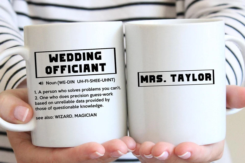 Funny Wedding Officiant Mug Officiant Gift For Men & Women Thank You Gift Product Details.. This high quality 11oz. ceramic white mug has a premium hard coat that provides crisp and vibrant color reproduction sure to last for years. Perfect for all hot & cold beverages. The highest quality printing possible is used. It will never fade no matter how many times you wash it. Material: 100% Ceramic. Print both sides. Dishwasher and Microwave Safe. High Gloss + Premium White Finish. Printed in the U.S.A. Personalized & Custom. We support personalized and custom mug to add custom, when placing an order, you can add notes to the "order note" in shipping address section. Also you can contact us directly via message. Shipping Info. Ready to ship in 1 to 2 business days, All products are made-to-order and proudly printed in the United States. Shipped by USPS and DHL, You will receive your order in 5-7 days. Replace & Refund. All products are defective during shipping broken, chipped will be replaced free of charge. You are not satisfied with the product, we will refund 100% money to you. If any other issues arise, please do not hesitate to message, we would be more than happy to assist you.