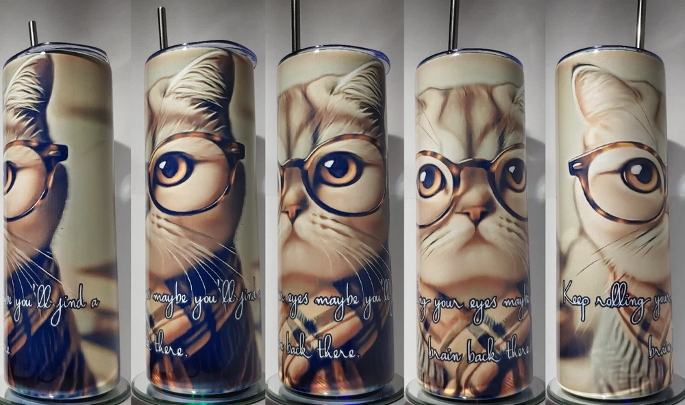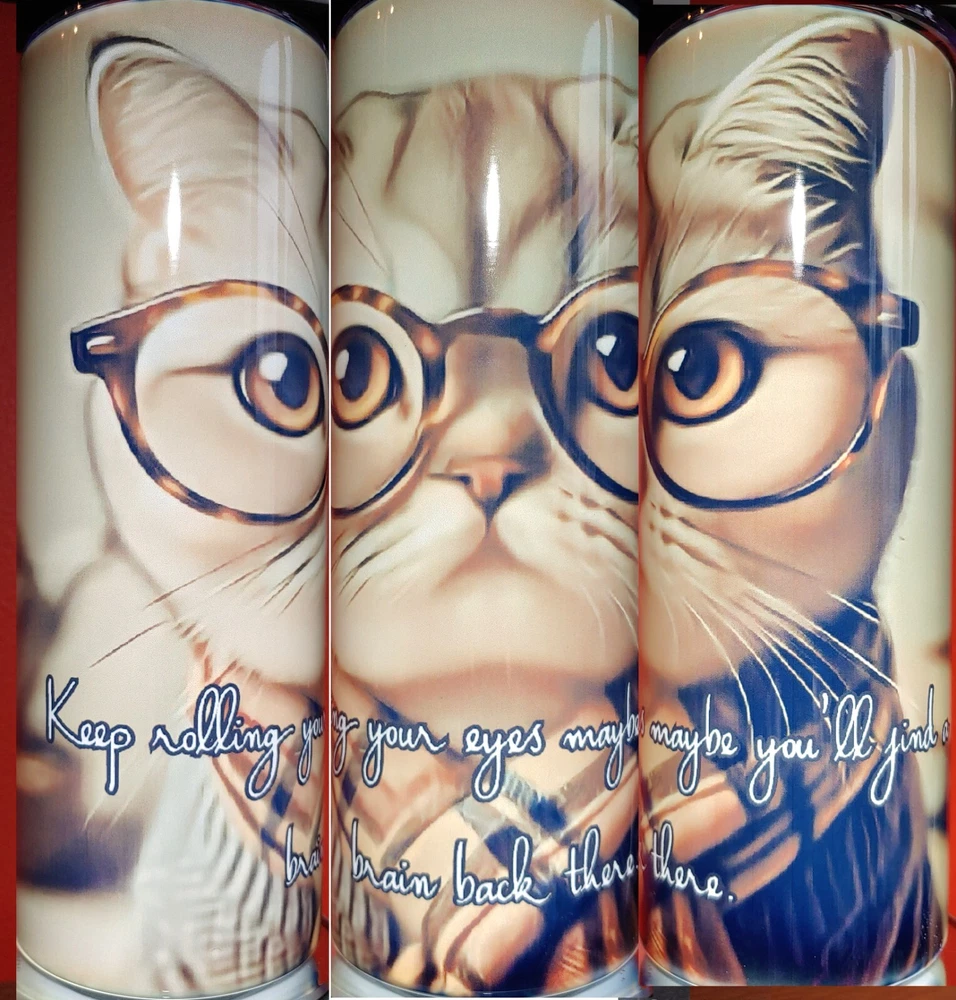 This stainless-steel tumbler is perfect for any cat lover. With a 20oz capacity, it keeps your hot or cold beverages at the perfect temperature for up to 6 and 8 hours, respectively. The tumbler comes with a slide lock, drink-through lid, and stainless steel straw, making it easy to sip on your favorite beverage. The multicolor cat pattern adds a touch of fun to your day, while the handcrafted design ensures that each tumbler is unique. This tumbler is great for teens, adults, and kids, and is perfect for use at home or on-the-go. It is recommended to hand wash only to keep your tumbler clean and shiny. Quote on tumbler: keep rolling your eyes maybe you'll find a brain back there.