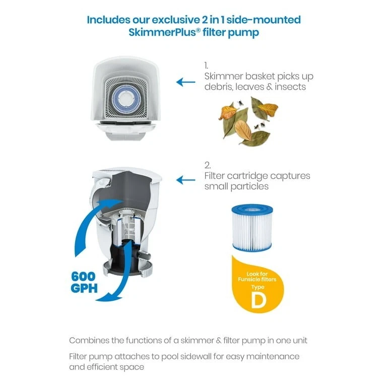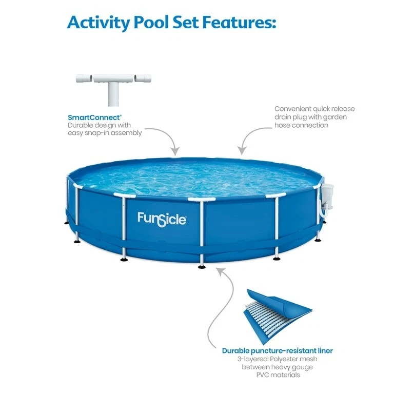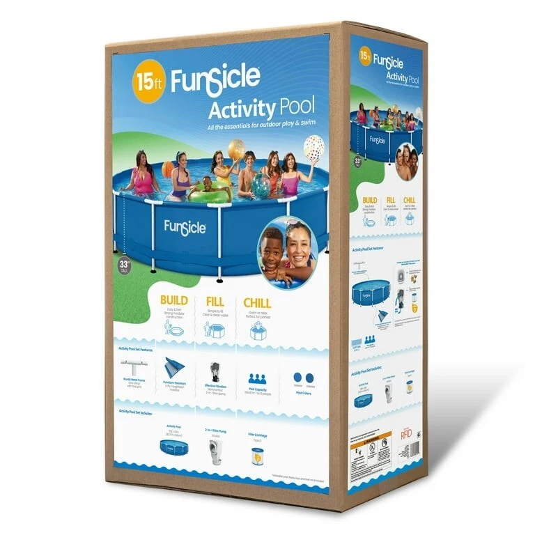 Transform your backyard into a summer haven with the Funsicle 15 ft Activity Pool. Perfect for families and outdoor enthusiasts, this above-ground pool features a sturdy metal frame and easy snap-in assembly. Enjoy clean, sparkling water thanks to the included SkimmerPlus™ SFX600 Filter Pump with GFCI, while the durable 3-ply Toughmesh™ materials ensure long-lasting use. Ideal for interactive games and swimming, it's quick to set up—simply snap the poles together, fill, and dive in! - Sturdy metal frame for durability - Easy snap-in assembly - Approximate inflated size: 15' x 33" - Includes Type D filter cartridge, GFCI plug, and repair patch - Suitable for ages 6 and up Perfect for creating memorable outdoor experiences, the Funsicle 15 ft Activity Pool is your go-to choice for summer fun!
