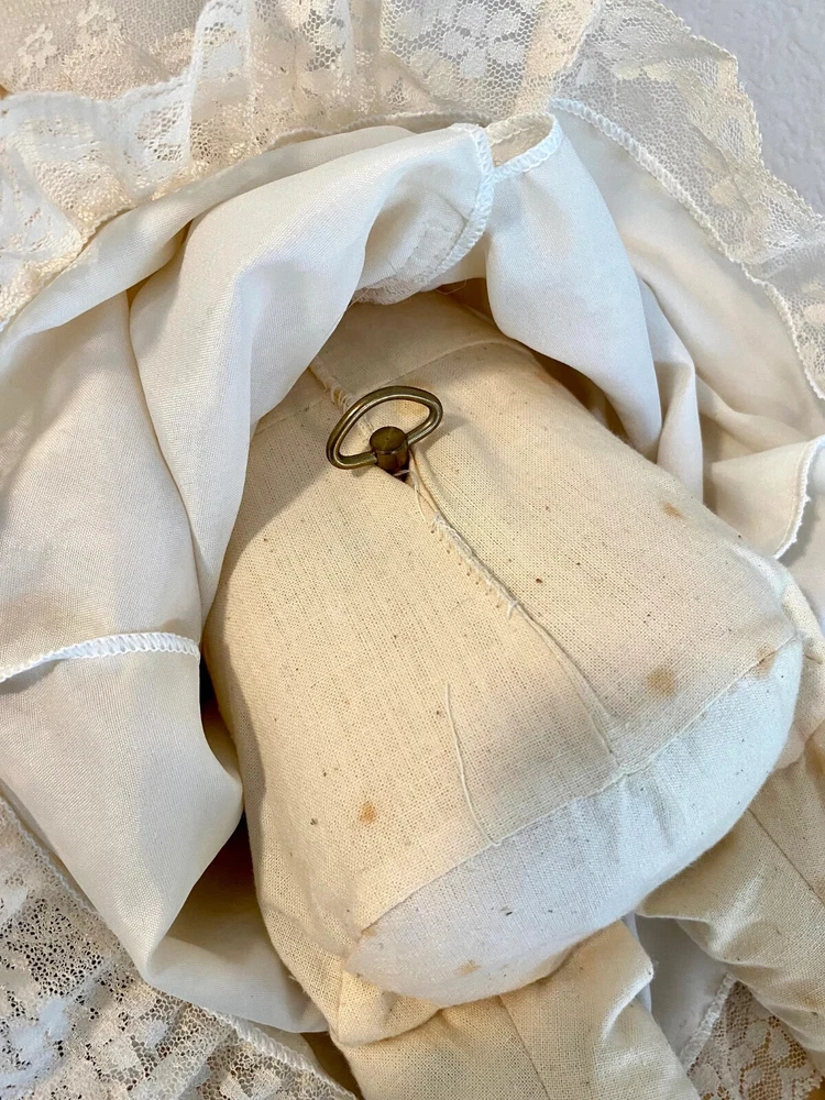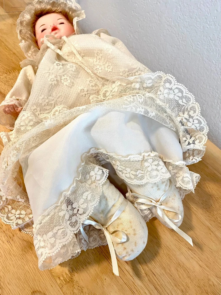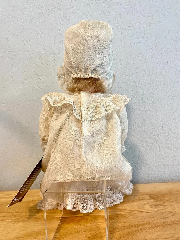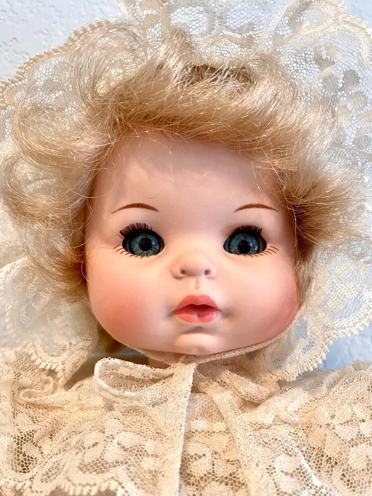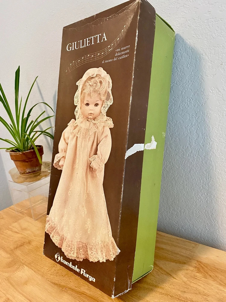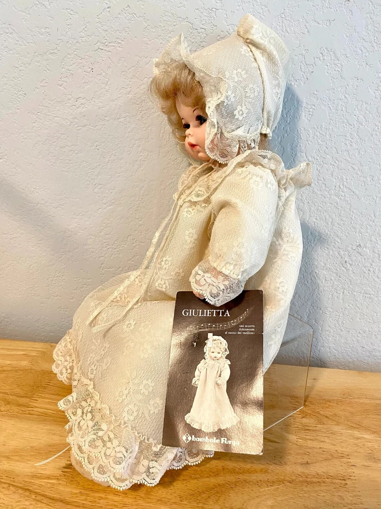 17" long - Italian Furga Made in Italy; late 50's, early 60's Marked on back of neck Original hand tag and box A rare doll in this country; sold in Europe * Poor storage has caused mold spots. * I treated the mold with chlorine and * Sprayed the doll with vinegar solution * Due to the music box, I could not wash the body. * Doll is odor free * Clothes are without spot, stain or odor Box is faded; lid has a torn corner Look at that BEAUTIFUL FACE Deep blue sleep eyes PLAYS Brahm's Lullaby while Head moves Bambola: a doll that looks real Vinyl head and arms; soft body and legs Rooted blonde hair She has sleepy blue eyes with full lashes Clothes are freshly washed Clothes are original, clean and complete Lovely Italian lace and nylon Her fingers curl She is very sweet to hold Look close, ask questions Thank you