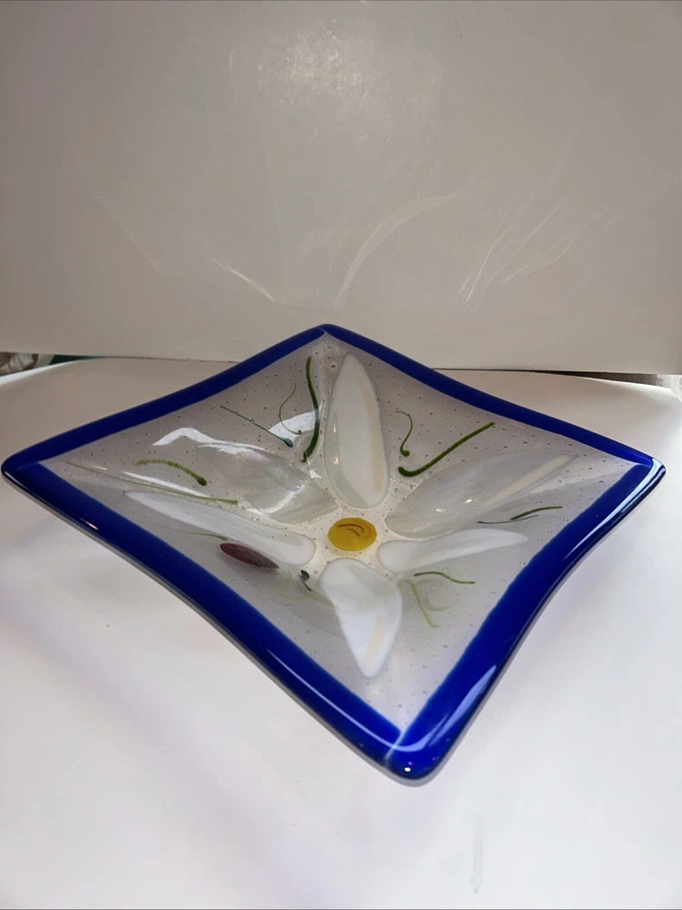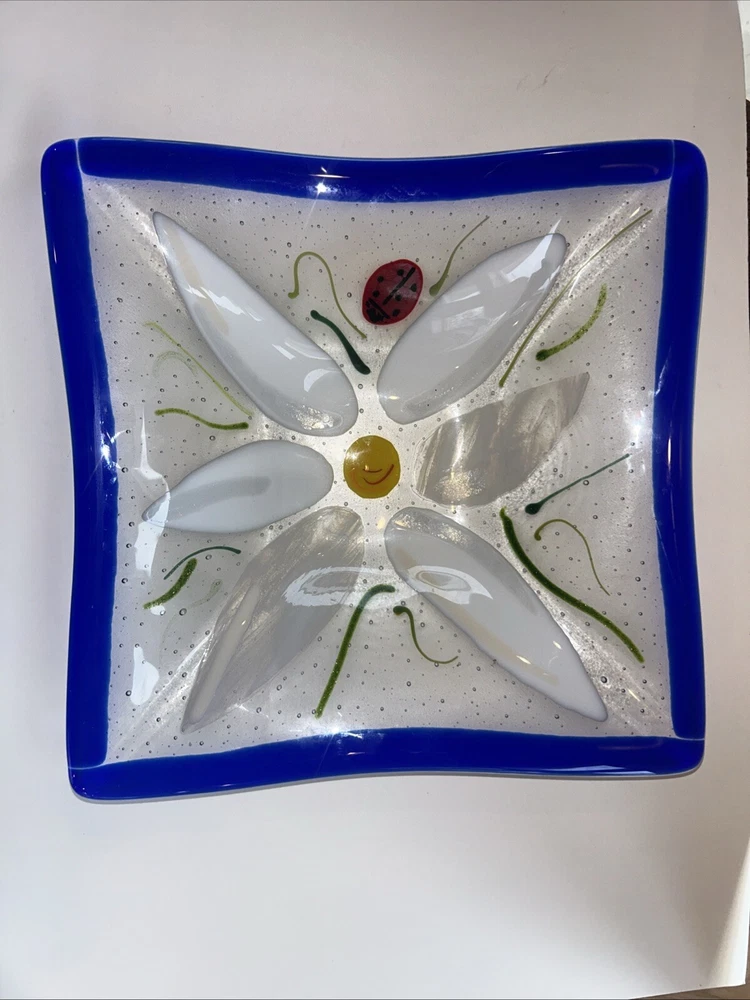 This is a beautifully crafted fused glass platter, plate, and bowl set in a vibrant multicolor art floral design. The 12-inch square piece features a charming daisy and ladybug motif, making it a delightful addition to any dining or display collection. The unmarked brand adds a touch of mystery and uniqueness to this decorative cookware piece, perfect for adding a pop of color and artistry to your home.kk405. 2.5 “ tall