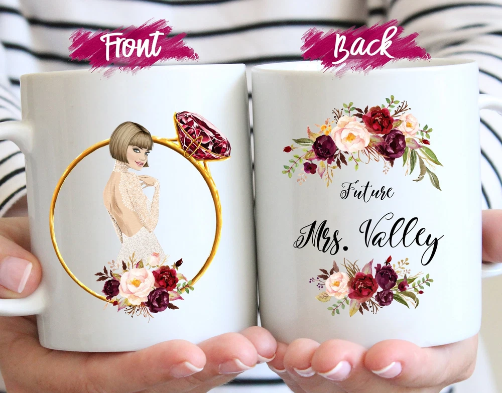 Future Mrs Mug Personalized Future Mrs. Mug Custom Wedding Proposal Mug Product Details.. This high quality 11oz. ceramic white mug has a premium hard coat that provides crisp and vibrant color reproduction sure to last for years. Perfect for all hot & cold beverages. The highest quality printing possible is used. It will never fade no matter how many times you wash it. Material: 100% Ceramic. Print both sides. Dishwasher and Microwave Safe. High Gloss + Premium White Finish. Printed in the U.S.A. Personalized & Custom. We support personalized and custom mug to add custom, when placing an order, you can add notes to the "order note" in shipping address section. Also you can contact us directly via message. Shipping Info. Ready to ship in 1 to 2 business days, All products are made-to-order and proudly printed in the United States. Shipped by USPS and DHL, You will receive your order in 5-7 days. Replace & Refund. All products are defective during shipping broken, chipped will be replaced free of charge. You are not satisfied with the product, we will refund 100% money to you. If any other issues arise, please do not hesitate to message, we would be more than happy to assist you.