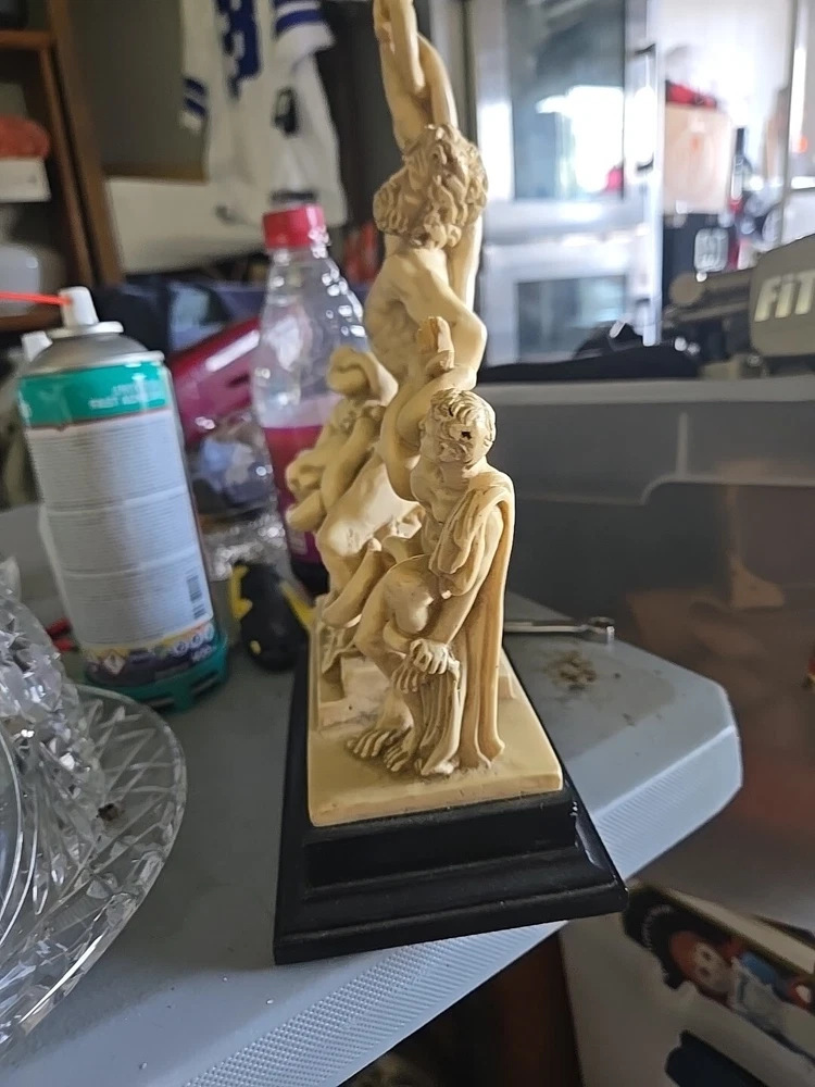 This is a vintage Italian sculpture by G. Ruggeri depicting Hercules on a marble base. The statue stands 11 inches tall and is carved from resin, showcasing a classical style with intricate details. It is signed by the artist and features a small size, making it a unique piece of art with a theme of Greek mythology. The craftsmanship and production technique reflect the artistry and skill of Italian sculpture.