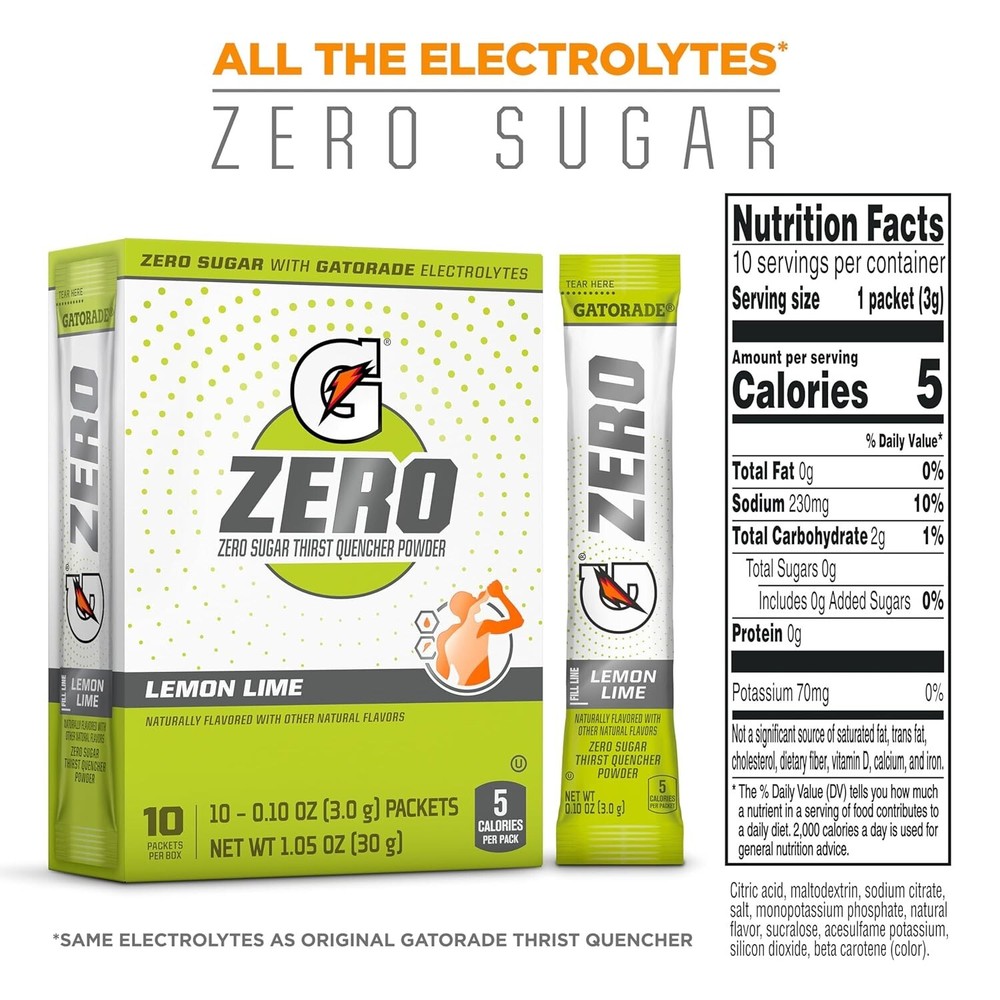 G Zero Powder, Lemon Lime, Packets, 10 Count Pack of 12 Includes 120 single serve packets of G Zero Powder Packets, Lemon Lime Flavor Pour one packet into a 20-fl. oz. water bottle, then shake until mixed Zero has no sugar while maintaining the same proven hydration and fueling benefits of Thirst Quencher. When you sweat, you lose more than water. Losses in fluids and electrolytes can negatively impact performance. Zero contains critical electrolytes to help replace what’s lost in sweat. During training, your energy needs are unique. Zero lets you replace what you’ve lost without adding more of what you may not need. 5-10 Calories Per Serving: Refueling goes beyond simply refilling. With minimal calories, Zero complements your nutritional efforts so you don’t need a workout after your workout. Developed for athletes that prefer a performance boost and not a sugar rush. Zero has no sugar while maintaining the same proven hydration and fueling benefits of Thirst Quencher.