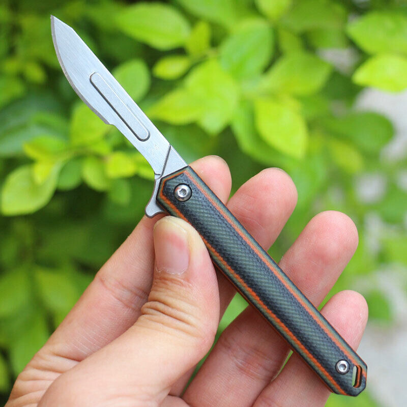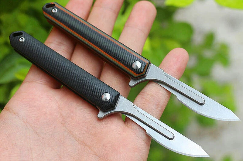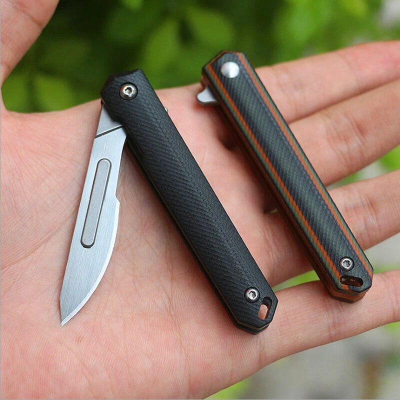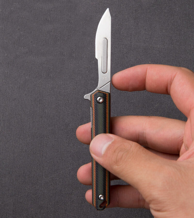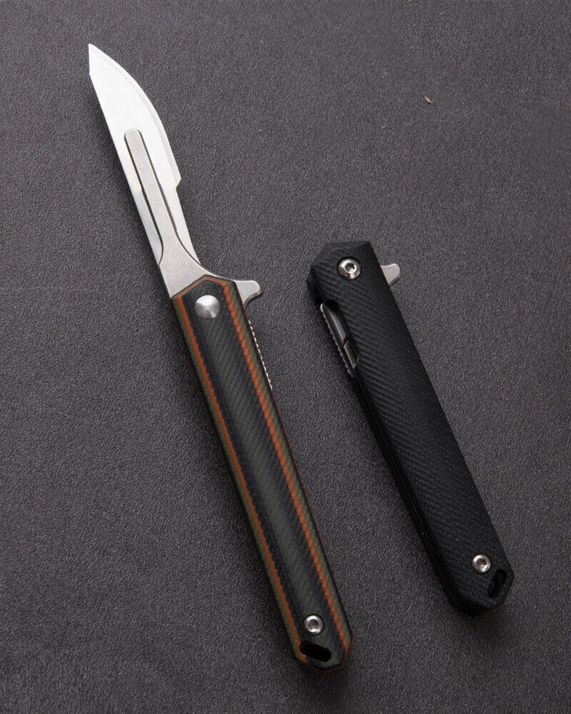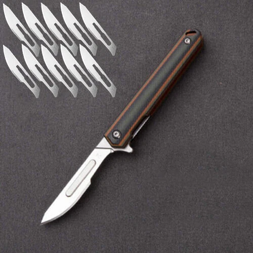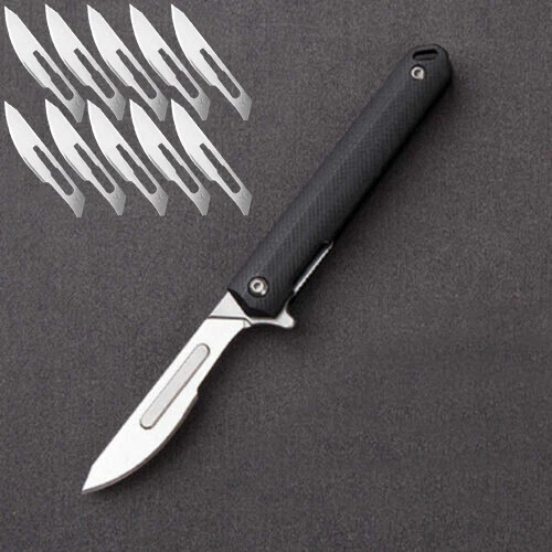 Description Description G10 Handle Utility Knife Scalpel Blade Mini Pocket EDC Tools Survival Camping Folding Keychain Details: Handle Material: G10 Locking Mechanism: Liner lock Blade Material: #24 Carbon Steel Color: Black, Red & Black Open Length: 127mm Close Length: 71mm Blade Length: 56mm Blade Width: 12mm Blade Thickness: 0.5mm Blade Hardness: 58-60HRC Net Weight: 25g Package: 1pcs G10 Handle with 10pcs 24# Blades