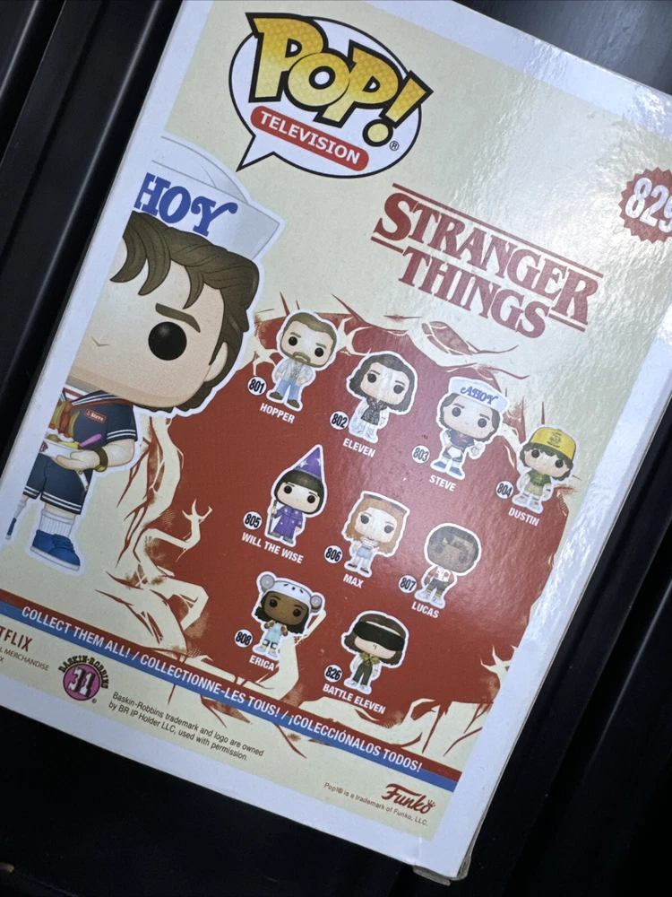 Box not best shape. Pls see photos. Introducing the G8 Funko Pop Stranger Things STEVE Baskin Robbins 31 Exclusive Vinyl Figure 829! This highly collectible figure is a must-have for any fan of the hit TV show Stranger Things. Featuring Steve Baskin, this Pop! figure is an exclusive item from Baskin-Robbins. Made from high-quality vinyl, this figure is part of the Pop! product line from Funko. It comes complete with all the features you would expect from a collectible item, including the ability to display it on your shelf or desk. Don't miss out on the chance to own this exclusive STEVE Baskin Robbins 31 Vinyl Figure 829!