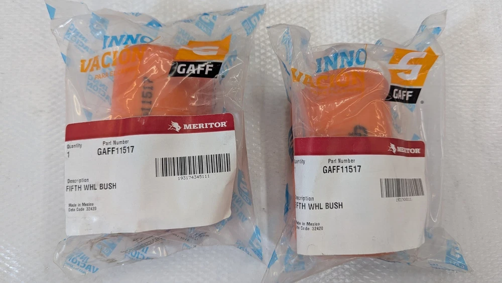 You get a pair of high quality POLY replacement bushings. High enough quality to be packaged in Meritor packaging. GAFF11517 Meritor Holland 5th Fifth Wheel Bushing Peterbilt Kenworth Fits the very common XA351 & XA331 Holland SAF 5th wheels replaces Holland SAF p/n XB-0011-2 Bushing measures 4 1/4 long 1 1/8 I.D. See photos for other dimensions. Free shipping