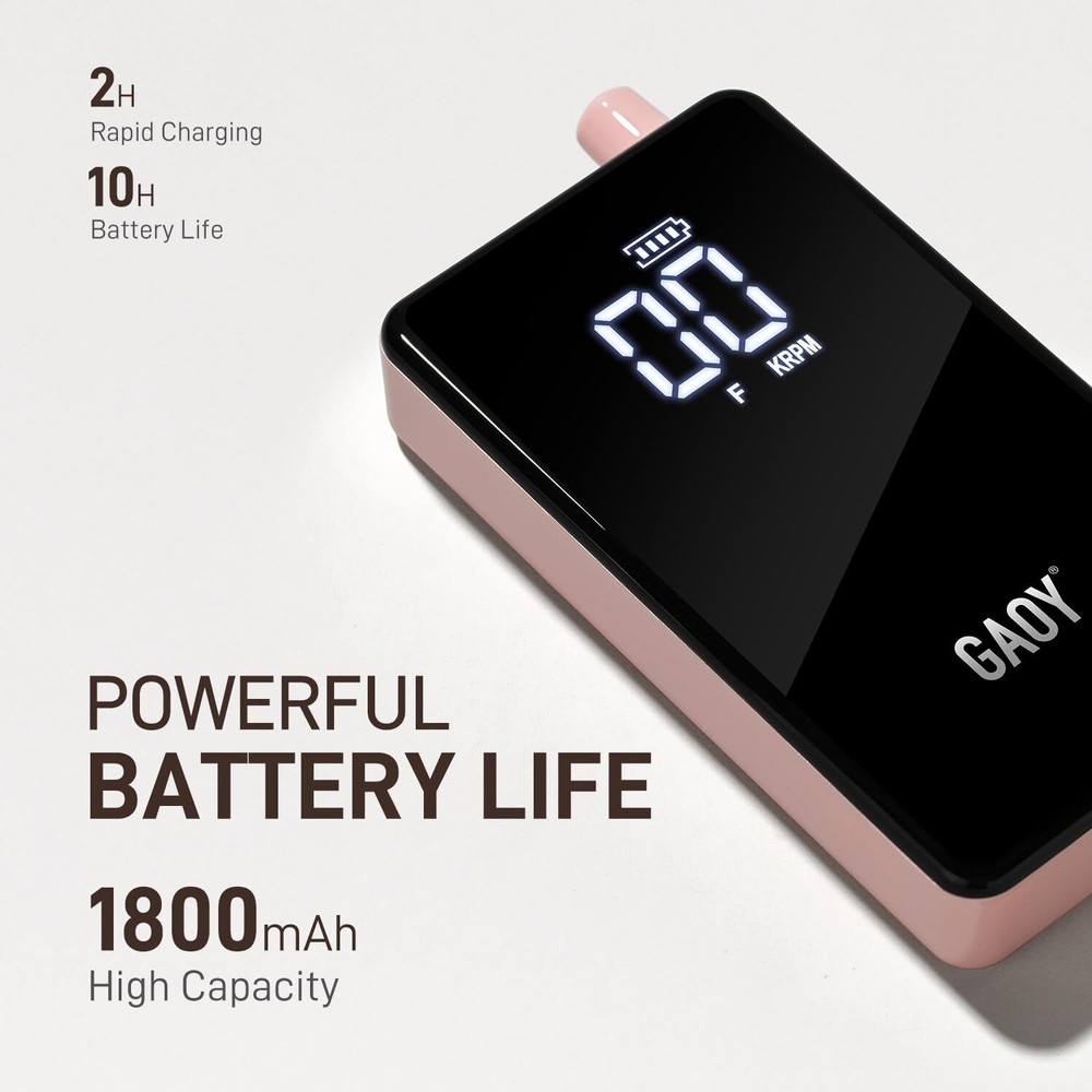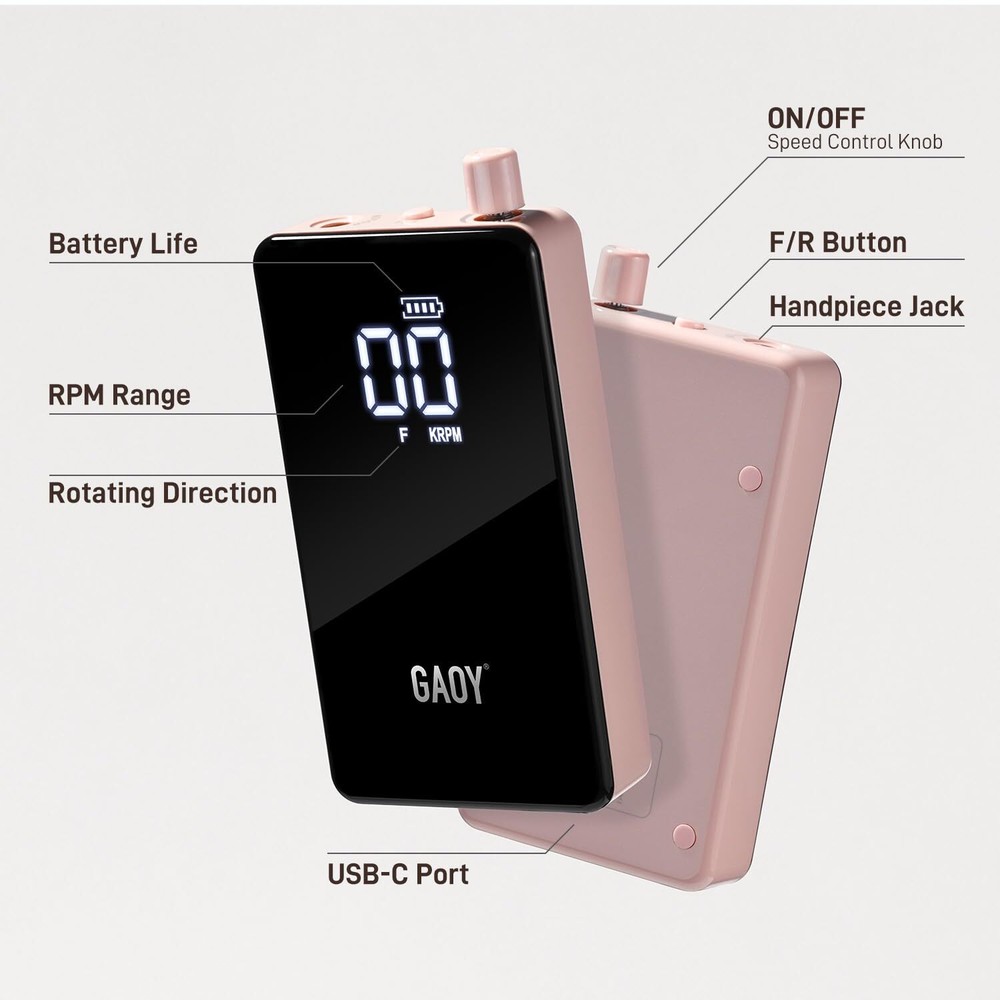 GAOY Cordless Nail Drill, Rechargeable E-File with 12 Drill Bits & 45 Sanding Bands, Long Battery Life, Low Noise, Perfect for Manicure & Pedicure, Pink Product Details Package Dimensions : 10.51 x 7.83 x 2.24 inches; 1.23 Pounds Item model number : DMJ042 Manufacturer : GAOY Cosmetics Inc. Country of Origin : China Brand: GAOY Material: Metal Model Name: DMJ042 Power Source: Battery Powered Maximum Rotational Speed: 2E+4 RPM Long-Lasting Battery Life: Enjoy extended usage with a powerful battery, allowing you to complete multiple sessions without frequent recharging. User-Friendly Design: Lightweight and comfortable to hold, our E-file is designed for ease of use. The intuitive speed display and simple controls let you adjust settings quickly, making your nail care routine seamless. Low Noise and Vibration: Engineered with premium bearings and a low-heat motor, this nail drill operates quietly and smoothly, providing a comfortable user experience. Versatile and Efficient: Capable of reaching up to 20,000 RPM, is perfect for both professional and home use. It accommodates standard drill bits and is suitable for both manicures and pedicures. Comprehensive Accessory Set: The nail drill comes equipped with 12 drill bits and 45 sanding bands.