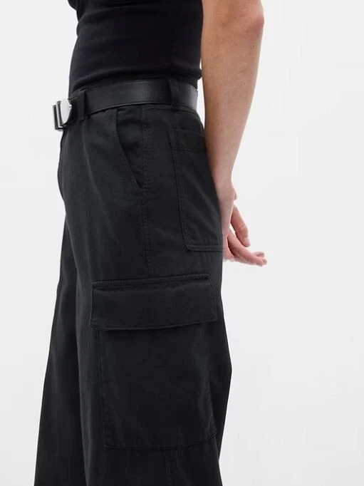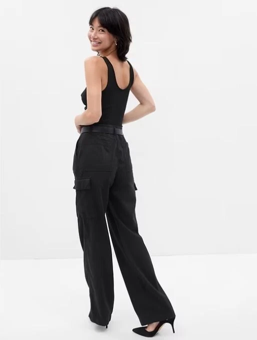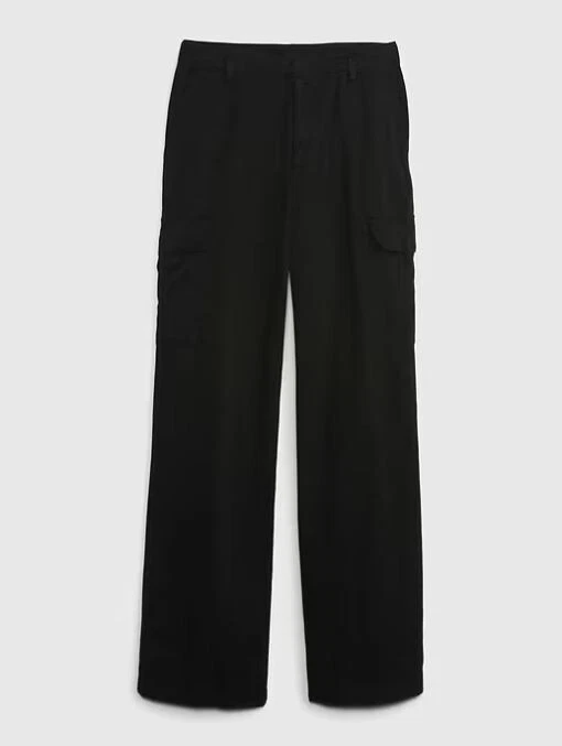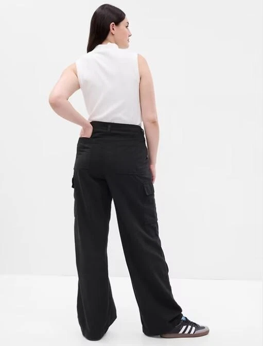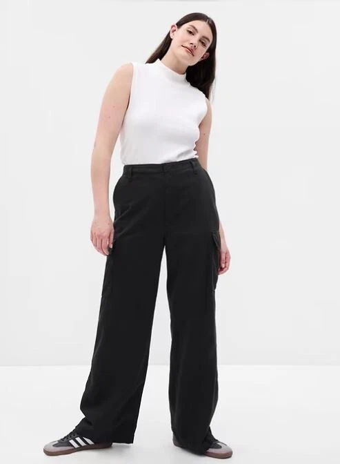 NEW WITH TAGS – GAP TWILL LOOSE CARGO PANTS Retail Price $89.95 Size: 4 PETITE Color: Black PRODUCT DETAILS: Smooth twill cargo pants Hidden button fly. Front slant pockets, back welt pockets. Side cargo pockets. #798433 FIT & SIZING: Our Mid Rise is a 9.5" (24 cm) rise. Loose through the hip & thigh. Loose, wide leg. Models wearing Gap size 27 are 5'8"–5'11" (172–180 cm) with 23.5–26" (60–66 cm) waist & 33–38" (84–97 cm) hips. Models wearing Gap size 33 are 5'8"–5'11" (172–180 cm) with 34–36” (86–91 cm ) waist & 45–50" (114–127 cm) hips. Inseam: Regular 29”, Petite 27" FABRIC & CARE: Cotton 82%, TENCEL™ 18% Machine wash. Imported.