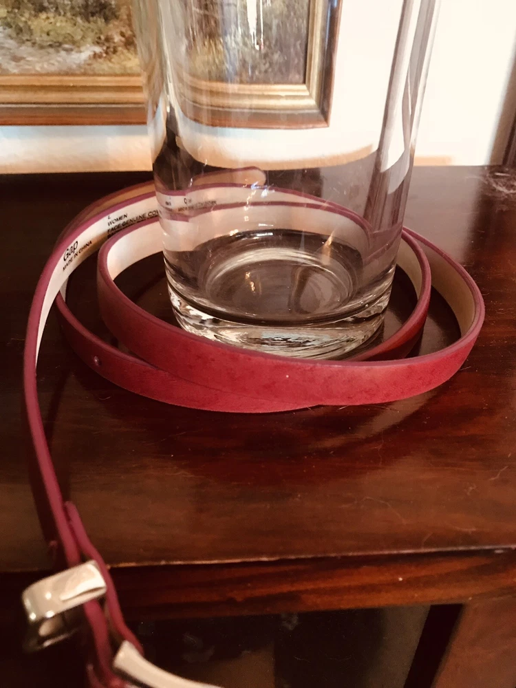 Crafted for style and functionality, this Gap women's waist belt is an essential accessory for any wardrobe. It features a sleek burgundy leather design, complemented by a striking silver buckle that adds a touch of elegance to your outfit. The belt is a versatile piece, easily adjustable to fit a waist size of 38.5 inches, and has a medium-width strap that measures 1/2 inch in width, ensuring a comfortable fit for regular size types.The belt's solid pattern is enhanced by subtle stitching details, providing a sophisticated finish. Its durable leather construction and solid burgundy color make it a perfect match for a variety of outfits, whether you're aiming for a casual look or dressing up for an evening event. The belt's design is punctuated by a metal theme, giving it a contemporary edge that's sure to impress.