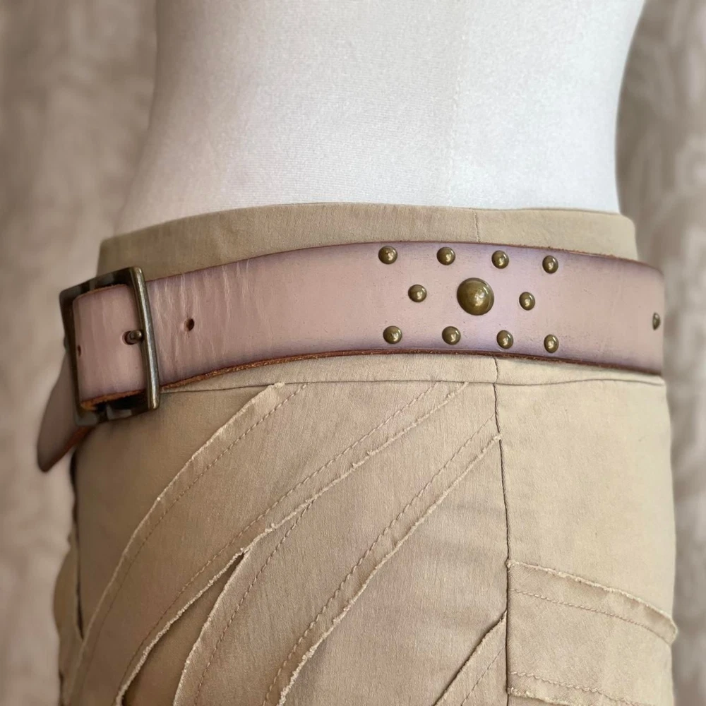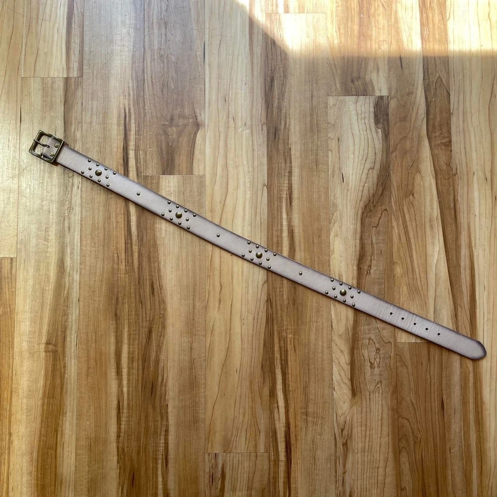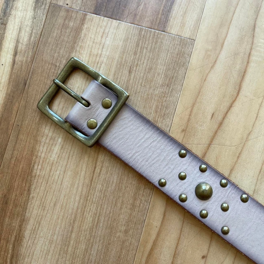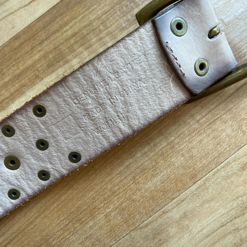 Grunge Stud Belt in Taupe and Bronze Description: taupe colored leather belt with bronze tone buckle and studs by GAP in US women’s size S. Condition: good condition. Some wear to the leather and some creasing throughout, especially in the area with the buckle holes. Dimensions: Length of belt, including buckle: 39.5 inches Length of belt not including buckle: 38.5 inches