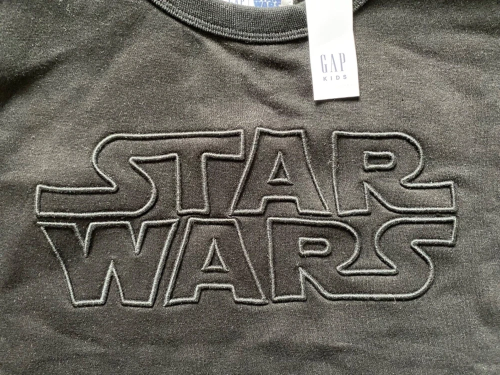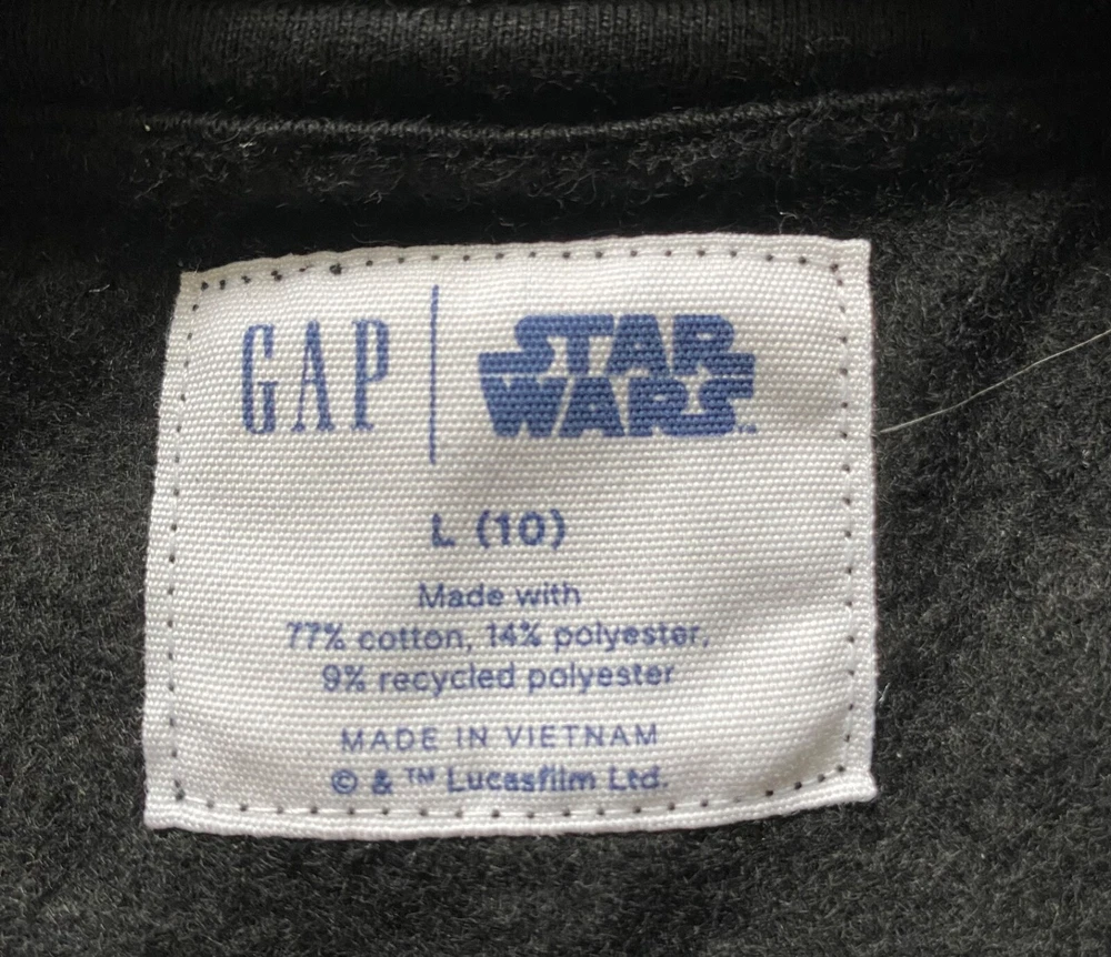 GAP KIDS STAR WARS~NEW~Black Star Wars Long Sleeve Sweatshirt~LARGE/10~NWT Boy's GAP KIDS Star Wars long sleeve sweatshirt *Retail price was $39.95 *Size: LARGE/10 *Fabric content: 77% cotton/23% polyester *Color: Black *Chest measurement: 19 inches from underarm to underarm at side seams laying flat *Length: 20 1/2 inches from top of shoulder to hem *Sleeve length: 19 inches from the top of shoulder at the seam to hem (may be 3/4 length???) *Condition: excellent, NEW condition with retail tag attached We have a smoke-free home.