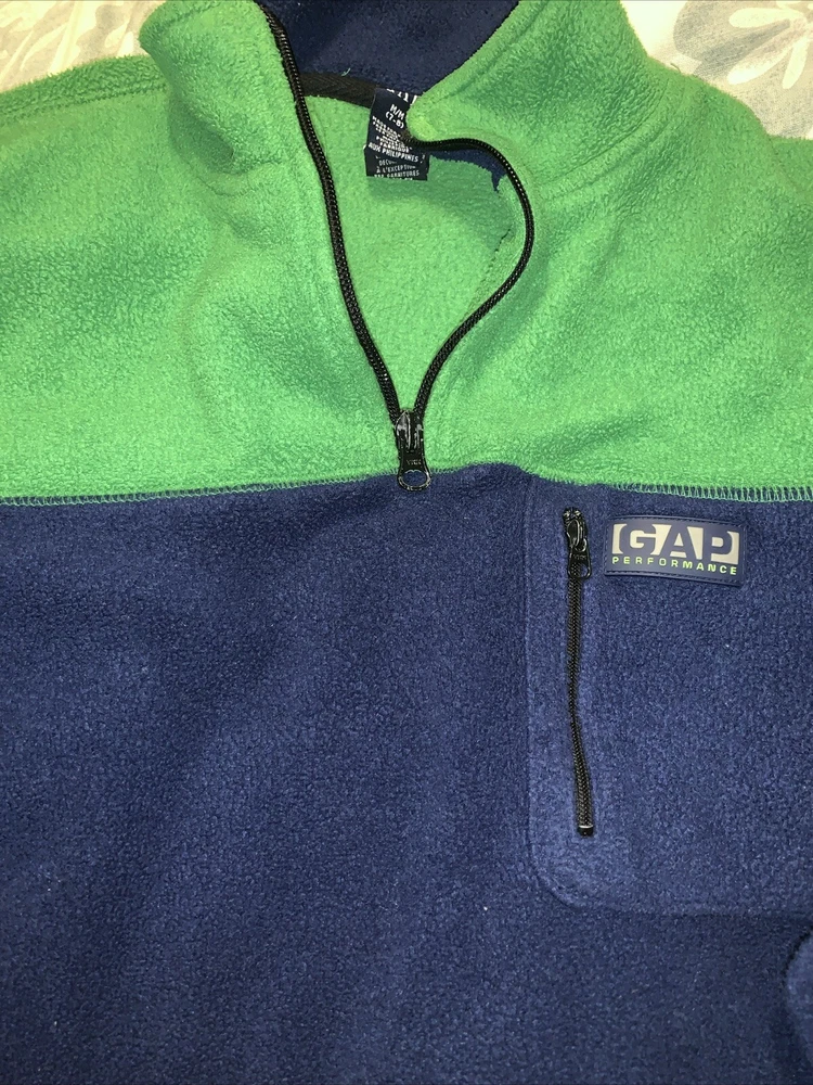 This GAP Kids Fleece Jacket is perfect for your little boy's winter, fall, or spring wardrobe. Made with 100% polyester material, this basic jacket is both comfortable and durable. The jacket features zipped pockets and a 1/4 zip, adding practicality to its style. The kelly green and navy colors of the jacket are perfect for boys who love outdoor activities and want to stay visible while playing. The fleece fabric type provides extra warmth. This jacket is available in size 7-8 medium and is ideal for boys who want to stay stylish and comfortable while playing. No stains or rips. From a pet free and smoke-free home.