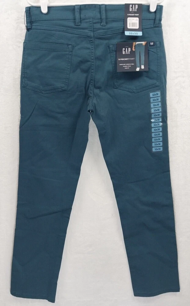 Season: Fall, Spring, Summer, Winter Model: Slim Fit Department: Men Handmade: No Vintage: No Waist Size: 32 in Color: Blue Product Line: 5 Pocket Pant Accents: Button, Logo, Zipper Fit: Slim Style: SLIM FIT Pocket Type: 5-Pocket Design Size Type: Regular Type: Jeans Closure: Zip Personalize: No Brand: Gap UPC: 719408212235 Inseam: 30 Pattern: Solid Features: Stretch Material: Cotton Blend gtin13: 719408212235 Size: 32 Garment Care: Machine Washable Rise: Mid (10-12 in)