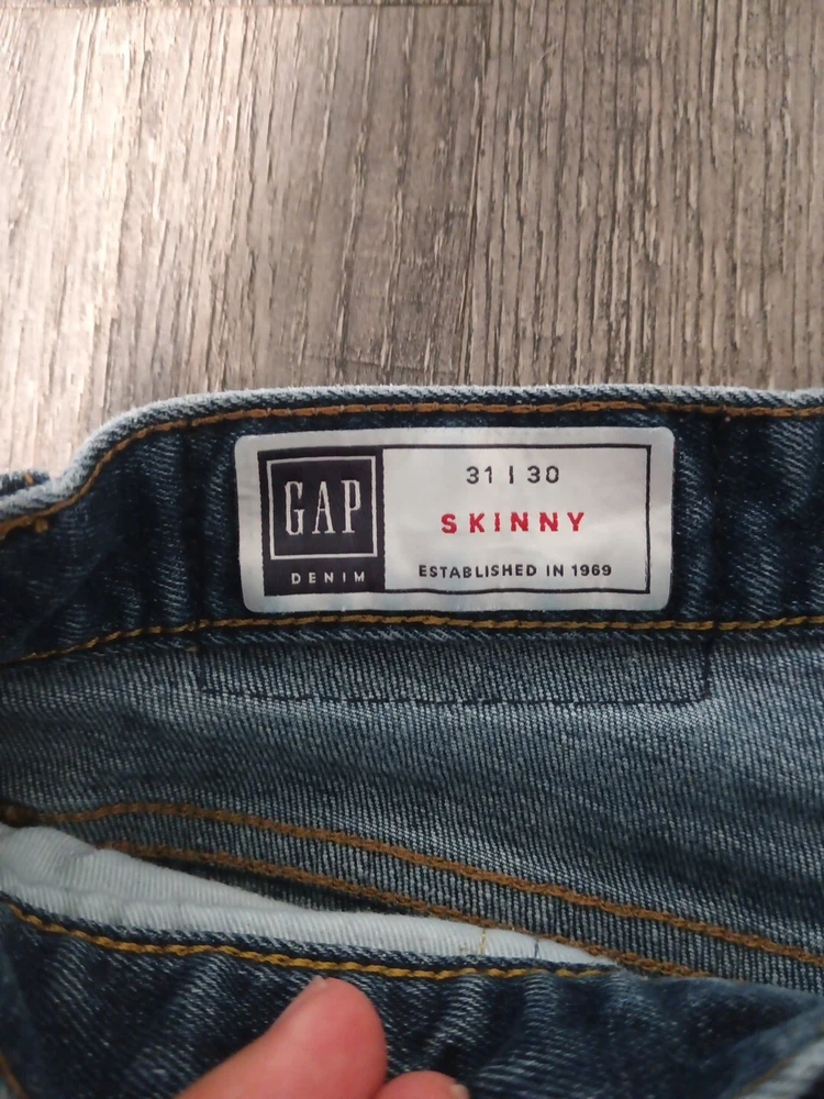 Accents: Button, Zipper Features: Distressed, Pockets Vintage: No Style: Skinny Model: GAP 1969 Type: Jeans Closure: Zip Department: Men Fit: Slim Theme: Preppy Size: 31 Fabric Wash: Dark Color: Blue Waist Size: 31 in Product Line: Gap 1969 Country/Region of Manufacture: Bangladesh Inseam: 30 in Fabric Type: Denim Material: Cotton Blend Brand: Gap Size Type: Regular
