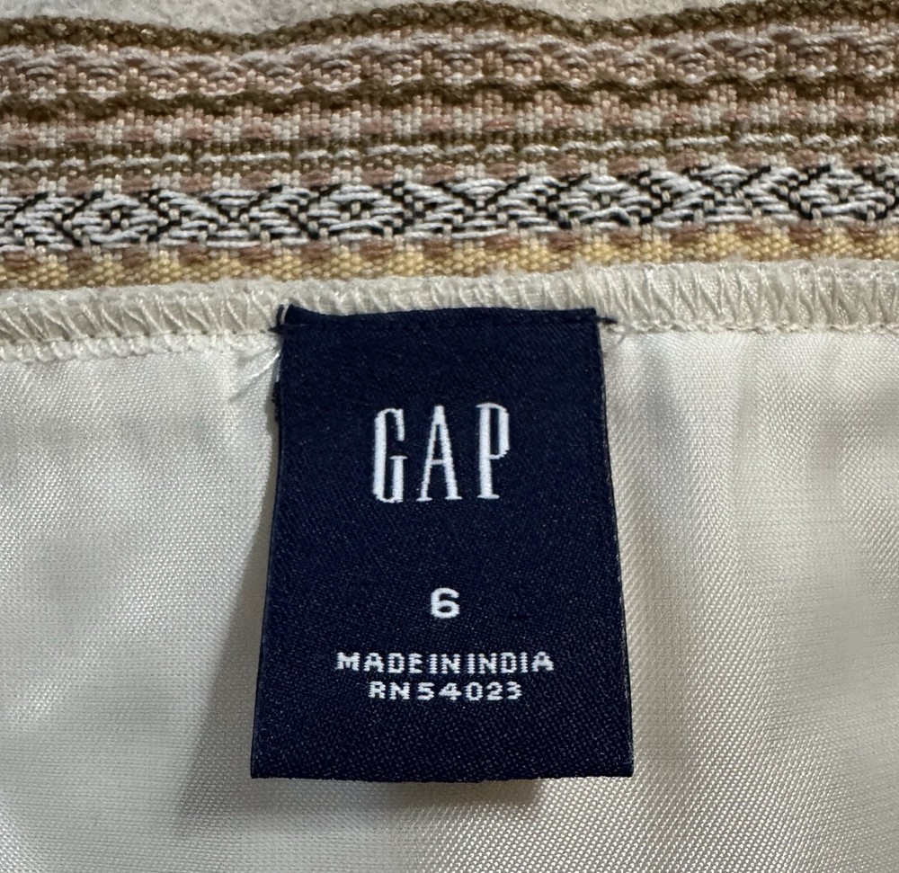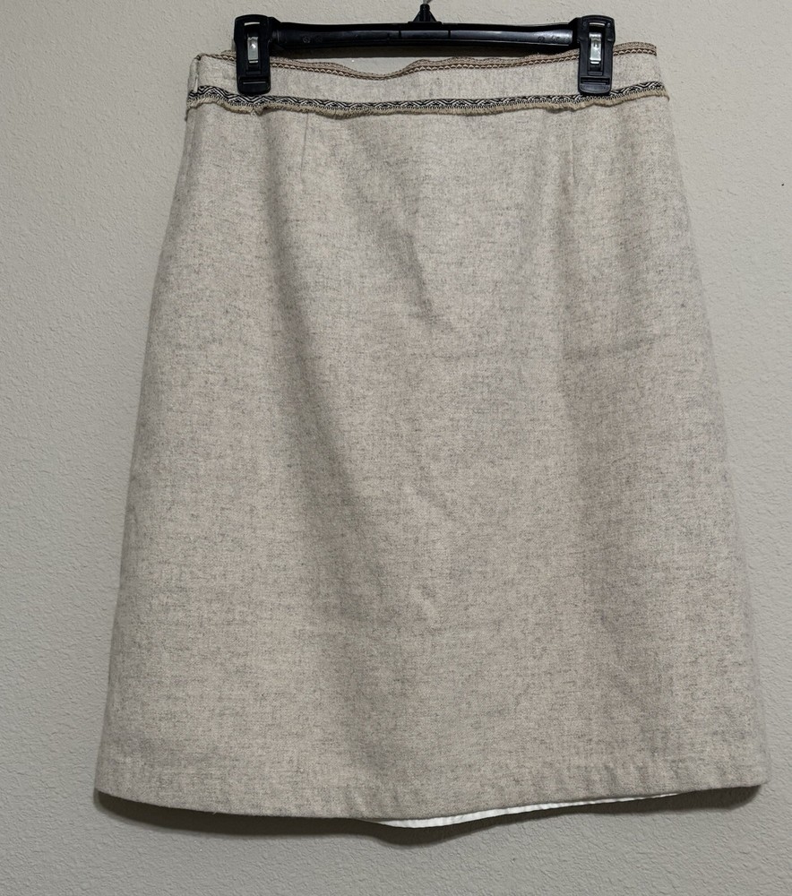 This vintage GAP wool midi skirt in oatmeal features a waist with short fringe detail. Ideal for various occasions like travel, parties, work, and business. The A-line skirt has an Aztec, and Southwestern theme with a high rise and wool fabric. It is size 6 and adorned with fringe accents, suitable for fall and winter seasons.