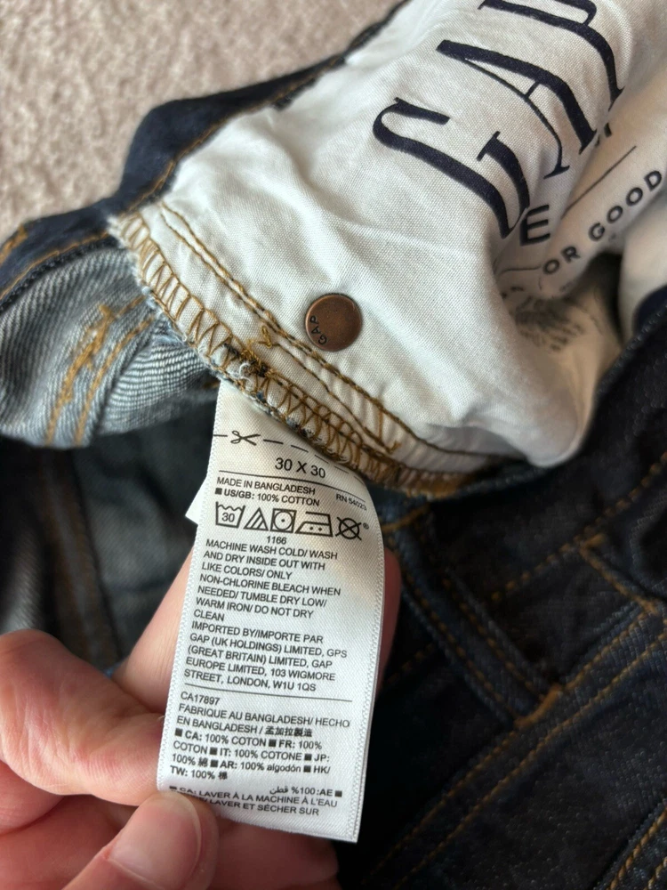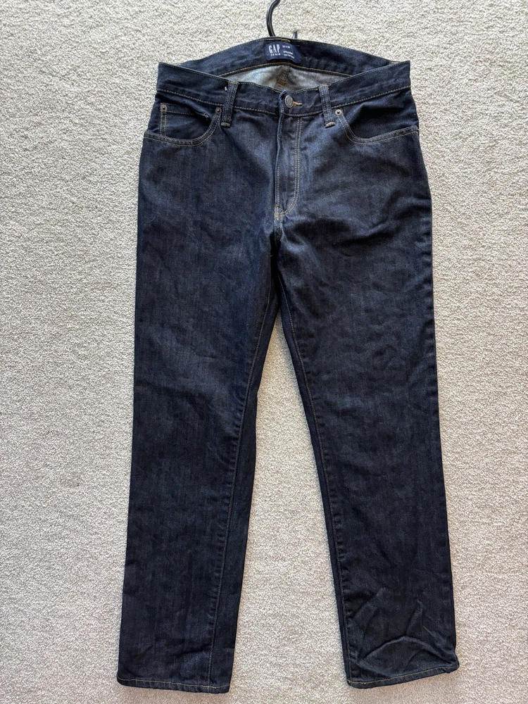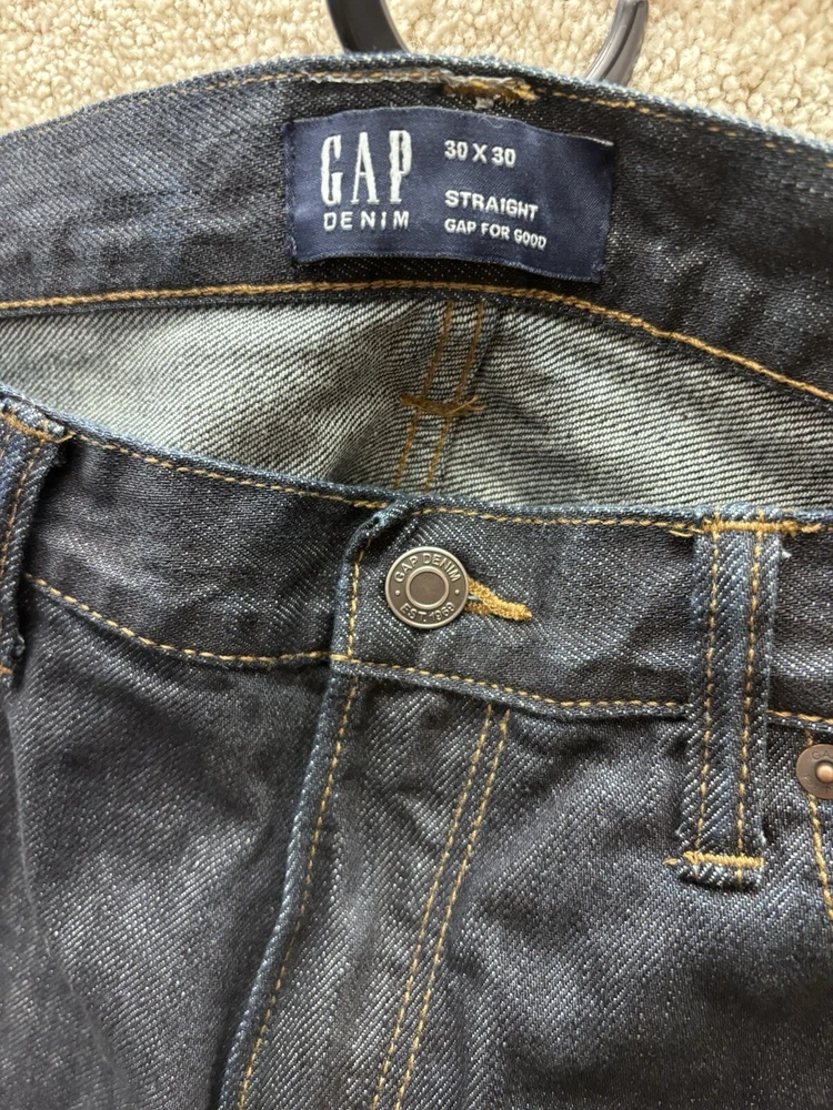 Features: Pockets Fabric Wash: Dark Size: 30x30 Theme: Modern Rise: Mid Color: Blue Department: Men Material: Cotton Fit: Straight Waist Size: 30" Pattern: Solid Type: Jeans Vintage: No Style: Straight Garment Care: Machine Washable Brand: Gap Product Line: Gap 1969 Model: Gap for Good Season: Fall, Spring, Summer Size Type: Regular Fabric Type: Denim Inseam: 30 in Accents: Zipper Closure: Zip