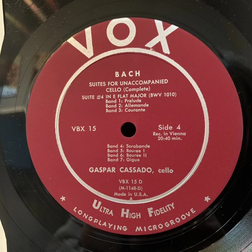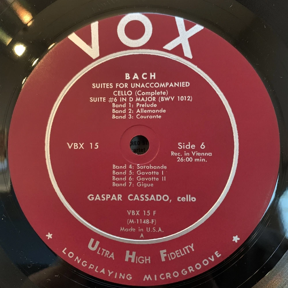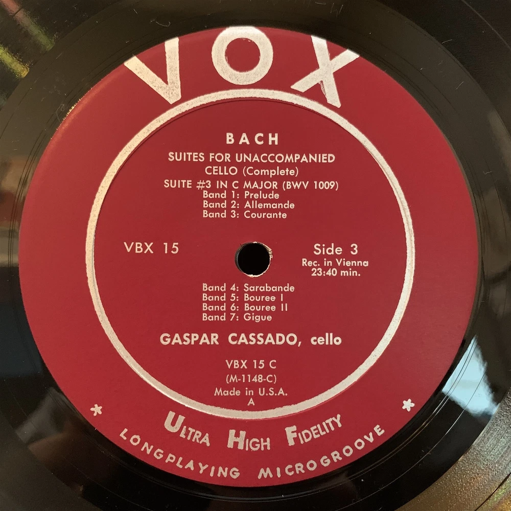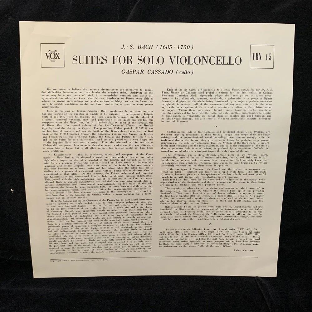 LABEL: Vox CATALOG #: VBX 15 SOLOIST: GASPAR CASSADO (cello) COMPOSER & WORKS: BACH Six Solo Suites CONDITION (VISUAL GRADING): EX lps (light sleeve wear/sleeve scuffs - no scratches or hairline marks). NM insert and NM pamphlet. VG+ jacket (some fraying of surface paper along right side and top right corner). Original Vox inner sleeves. ADDITIONAL DETAILS: Mono 3LP boxset with insert sheet and advertising pamphlet. Released 1960. RVG stamped in deadwax, mastered by Rudy Van Gelder. No returns or negative comments please. ----------B23----- VIRTUOSO VINYL RECORDS DOMESTIC U.S. BUYERS PAYMENT - U.S. buyers to pay by PAYPAL. USA SHIPPING & HANDLING – Your item will be shipped by Media Mail with a tracking number in a good-quality cardboard LP mailer box. If you have specific packaging requests (double boxing, etc), contact me with these special requests BEFORE paying so that I can calculate the extra cost of materials and postage. DISCOUNTED RATES FOR MULTIPLE PURCHASES IF YOU WAIT FOR THE SELLERS INVOICE – For combined shipping, I will add $1 for each additional item added to the shipping cost of the heaviest item. If eBay does not calculate this correctly for you, kindly put your items in a shopping cart together and then click "request invoice" to request a correct combined invoice BEFORE paying. The “request invoice” feature is not available on mobile phone apps so please use a real computer on the ebay site to do so. Please do not forget, the SHIPPING DISCOUNTS DO NOT APPLY if you make separate payments for items or if you pay an improperly-calculated non-discounted ebay-generated total. This is because non-refundable ebay & paypal fees are taken from the shipping as well as from the items when you pay. INTERNATIONAL BUYERS This item is available to international buyers through eBay’s Global Shipping Program (GSP). GRADING : NM (+/-), E (+/-), VG (+/-), (Good, Fair, Poor) Lps are visually graded and have not been sound-tested so it is very possible that there will be noise not mentioned in the description. Vintage sealed items have obviously not been sound tested and carry no warranty. In general I recommend cleaning all lps before playback, as most have not been machine cleaned. NM+ usually means the lp looks brand new or was sealed and was recently opened (I rarely use this grade). NM usually means that the lp has no significant marks and plays with little noise. NM minus will have some sleeve residue, minor surface wear, surface noise, and/or minor scuffs and hairlines. E will show light wear or surface marks and will have some surface noise. VG+ will have medium wear and marks/scratches and will play with surface noise. VG will have heavier wear and significant marks/scratches and will play with considerable surface noise. Jackets - I try to mention significant damage like seam splits, writing and corner creases, but most jackets will show some minor signs of age or shelf wear. NM jackets are usually like new or in original plastic. ADDITIONAL INFO Items are sold AS-IS with no returns/refunds. Please take this into consideration when buying clearance or as-is items or items that are graded below NM. Please view my 75K+ sales and 8K+ feedbacks and feel confident that I am not trying to cheat anyone by using an as-is policy. Kindly ask questions before you purchase an item or request a second inspection - I am happy to help. If you have a problem with an item, kindly send me a message through the eBay message system. Please do not jump to opening a return case without contacting me first. Buyers who do this or who exaggerate in order to force a return will be blocked and reported to eBay. The very high cost of shipping & sales & transaction fees, differing equipment & standards, and the fact that the lps are not fully sound-certified on your equipment are the biggest reasons for my no return policy. Thanks for finding my store and checking out my items – I am sure you will enjoy them! Powered by SixBit's eCommerce Solution