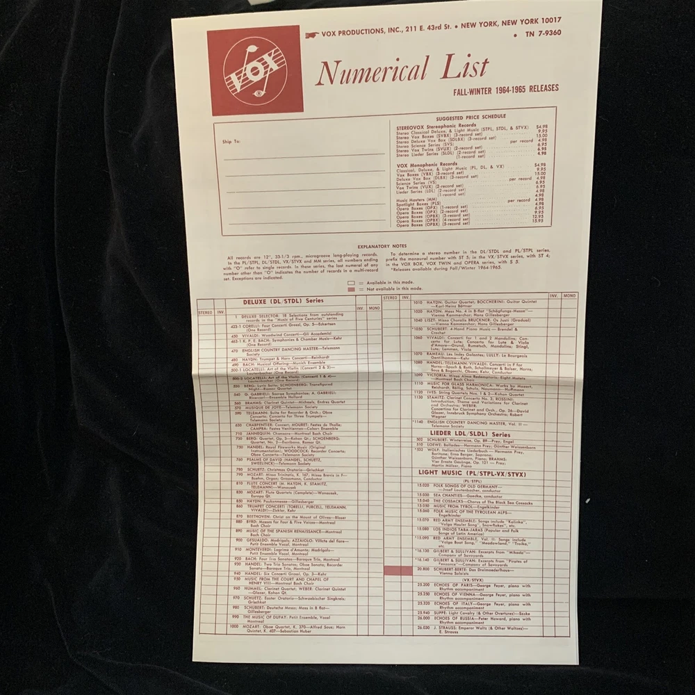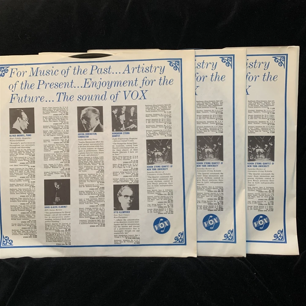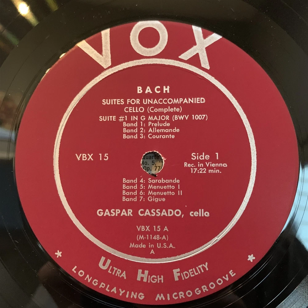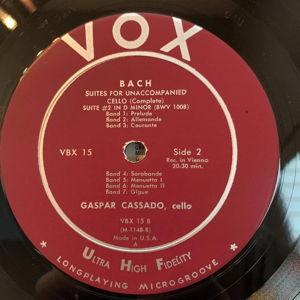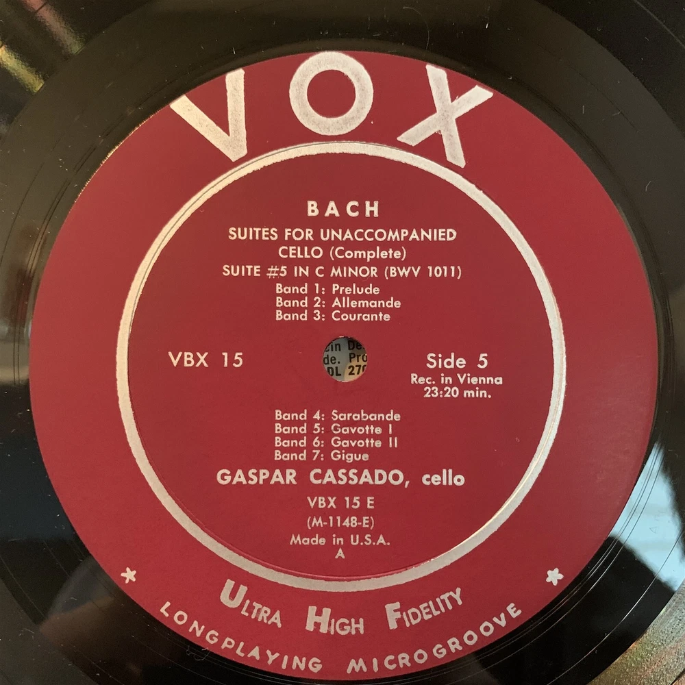 LABEL: Vox CATALOG #: VBX 15 SOLOIST: GASPAR CASSADO (cello) COMPOSER & WORKS: BACH Six Solo Suites CONDITION (VISUAL GRADING): EX lps (light sleeve wear/sleeve scuffs - no scratches or hairline marks). NM insert and NM pamphlet. VG+ jacket (some fraying of surface paper along right side and top right corner). Original Vox inner sleeves. ADDITIONAL DETAILS: Mono 3LP boxset with insert sheet and advertising pamphlet. Released 1960. RVG stamped in deadwax, mastered by Rudy Van Gelder. No returns or negative comments please. ----------B23----- VIRTUOSO VINYL RECORDS DOMESTIC U.S. BUYERS PAYMENT - U.S. buyers to pay by PAYPAL. USA SHIPPING & HANDLING – Your item will be shipped by Media Mail with a tracking number in a good-quality cardboard LP mailer box. If you have specific packaging requests (double boxing, etc), contact me with these special requests BEFORE paying so that I can calculate the extra cost of materials and postage. DISCOUNTED RATES FOR MULTIPLE PURCHASES IF YOU WAIT FOR THE SELLERS INVOICE – For combined shipping, I will add $1 for each additional item added to the shipping cost of the heaviest item. If eBay does not calculate this correctly for you, kindly put your items in a shopping cart together and then click "request invoice" to request a correct combined invoice BEFORE paying. The “request invoice” feature is not available on mobile phone apps so please use a real computer on the ebay site to do so. Please do not forget, the SHIPPING DISCOUNTS DO NOT APPLY if you make separate payments for items or if you pay an improperly-calculated non-discounted ebay-generated total. This is because non-refundable ebay & paypal fees are taken from the shipping as well as from the items when you pay. INTERNATIONAL BUYERS This item is available to international buyers through eBay’s Global Shipping Program (GSP). GRADING : NM (+/-), E (+/-), VG (+/-), (Good, Fair, Poor) Lps are visually graded and have not been sound-tested so it is very possible that there will be noise not mentioned in the description. Vintage sealed items have obviously not been sound tested and carry no warranty. In general I recommend cleaning all lps before playback, as most have not been machine cleaned. NM+ usually means the lp looks brand new or was sealed and was recently opened (I rarely use this grade). NM usually means that the lp has no significant marks and plays with little noise. NM minus will have some sleeve residue, minor surface wear, surface noise, and/or minor scuffs and hairlines. E will show light wear or surface marks and will have some surface noise. VG+ will have medium wear and marks/scratches and will play with surface noise. VG will have heavier wear and significant marks/scratches and will play with considerable surface noise. Jackets - I try to mention significant damage like seam splits, writing and corner creases, but most jackets will show some minor signs of age or shelf wear. NM jackets are usually like new or in original plastic. ADDITIONAL INFO Items are sold AS-IS with no returns/refunds. Please take this into consideration when buying clearance or as-is items or items that are graded below NM. Please view my 75K+ sales and 8K+ feedbacks and feel confident that I am not trying to cheat anyone by using an as-is policy. Kindly ask questions before you purchase an item or request a second inspection - I am happy to help. If you have a problem with an item, kindly send me a message through the eBay message system. Please do not jump to opening a return case without contacting me first. Buyers who do this or who exaggerate in order to force a return will be blocked and reported to eBay. The very high cost of shipping & sales & transaction fees, differing equipment & standards, and the fact that the lps are not fully sound-certified on your equipment are the biggest reasons for my no return policy. Thanks for finding my store and checking out my items – I am sure you will enjoy them! Powered by SixBit's eCommerce Solution