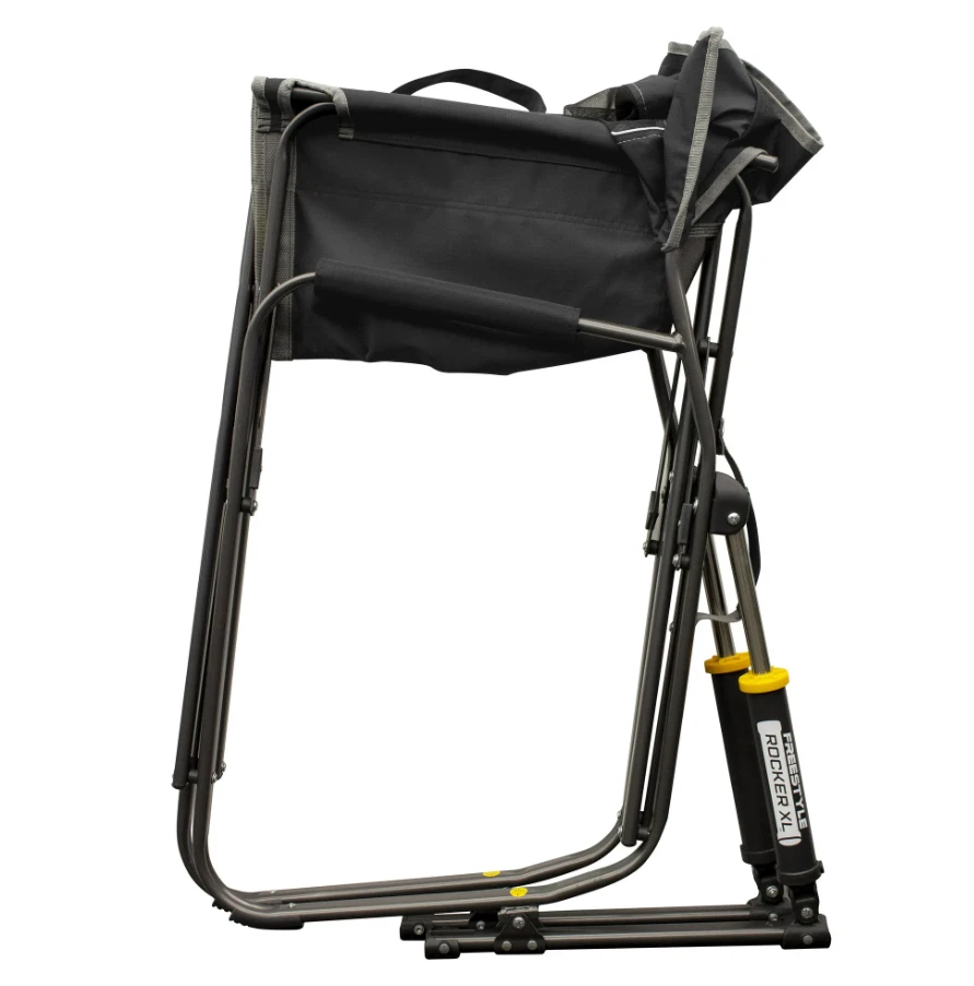 About this item GCI Outdoor Freestyle Rocker XL Heavy Duty Portable Folding Camping Chair, Black Over-sized height and width outdoor rocking chair Patented spring-loaded shocks for a smooth rocking motion Eazy-Fold Technology for safe and simple opening and closing Solid armrests for extra support when sitting down or standing up Durable, nylon mesh backrest for continual airflow to keep you cool in warmer weather Heavy-duty, powder-coated steel frame provides comfort and durability Fold-flat design for storage and transporting Convenient carry handle offers easy portability Convenient beverage holder and phone pocket Weight capacity: 400 lb Open Dimensions: 25.6" Depth x 26.4" Width x 34.8" Height (Seat Height: 20") Folded Dimensions: 25" Depth x 4.9" Width x 34.8" Heigh Item Weight: 13.4 lb Adult chair