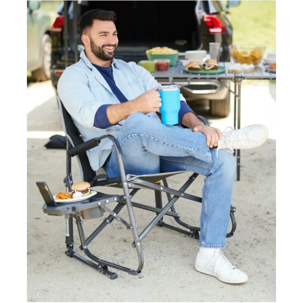 1. This chair is a game-changer for outdoor relaxation! The oversized design is super comfy, and the built-in side table is so handy for drinks or snacks. The rocking motion is smooth and relaxing—perfect for camping, tailgating, or just lounging in the backyard. Sturdy construction and easy to fold up for storage. Highly recommend!