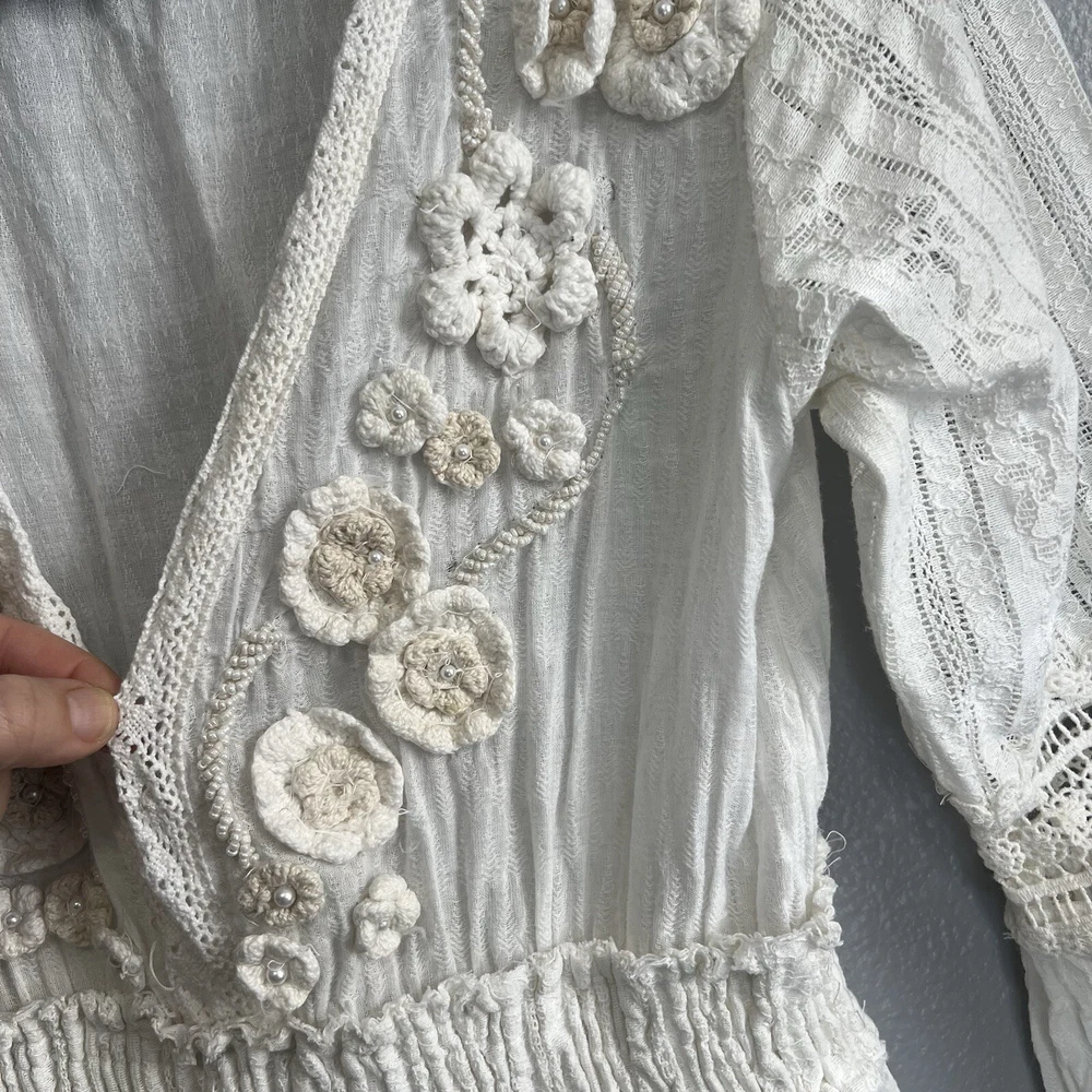 GD Golden Days PARIS lace boho maxi dress - women's size Small. Long beautiful 100% cotton lace dress. It is semi-sheer with a small skirt lining underneath that's approximately 13" long. Deep open V-neck. Has crocheted flowers all over the front with beading and embroidery. Approximate flat measurements: Pit to pit: 17" Length: 51" Elastic Waist: 12" Arm (neck to hem): 20.5" Good pre-owned condition. No tears, rips, or stains. Some threads look like they are fraying on the elastic waist, but there are no holes. Please see the photos for more details on the item, condition, and measurements.