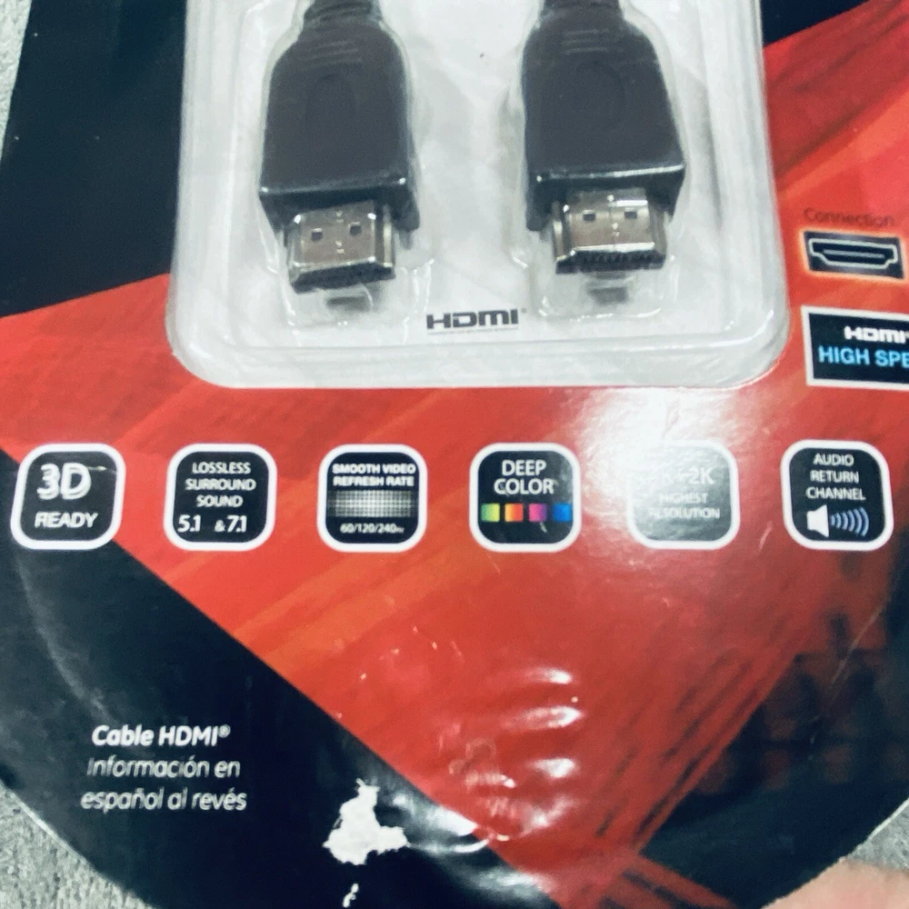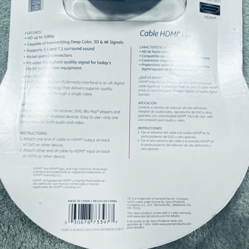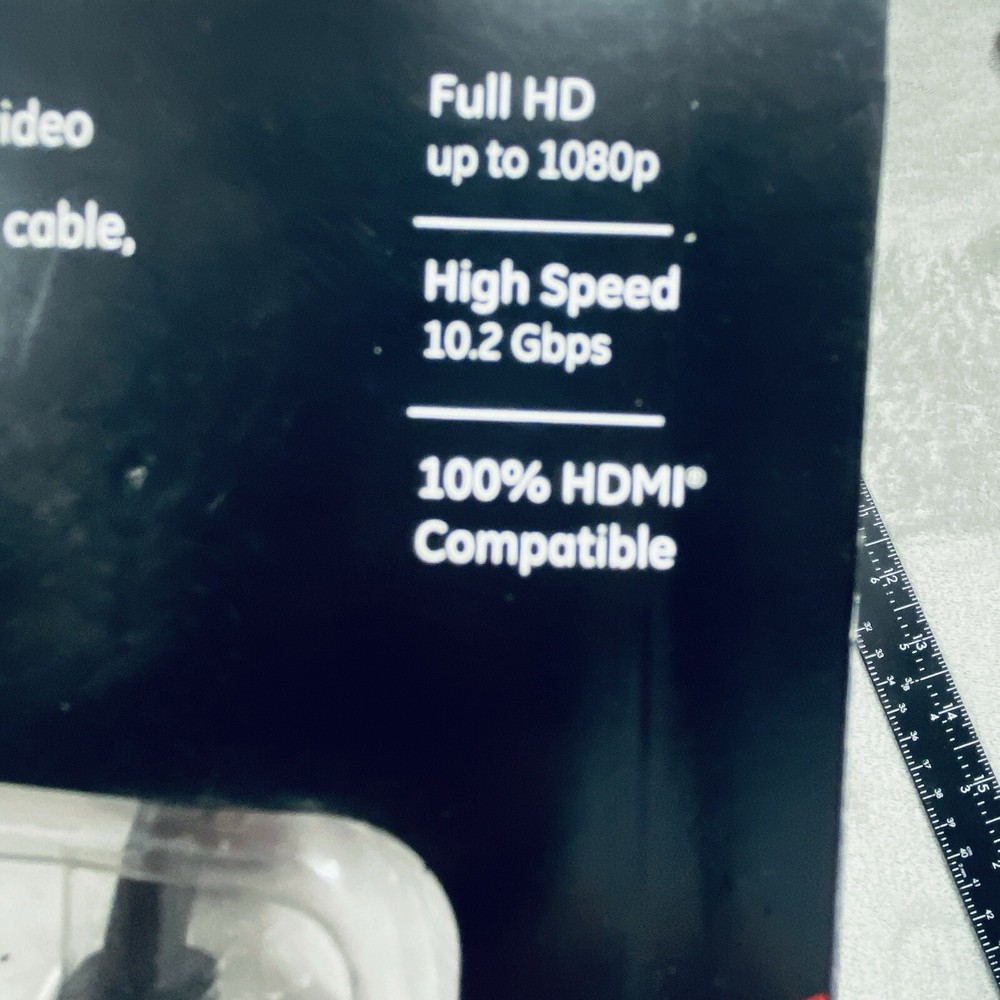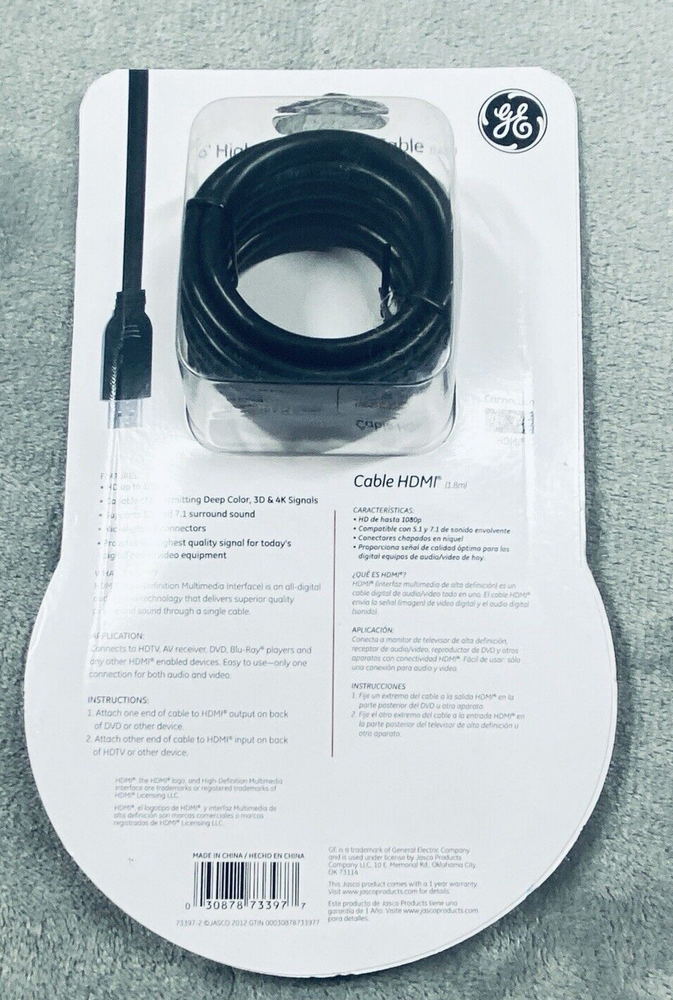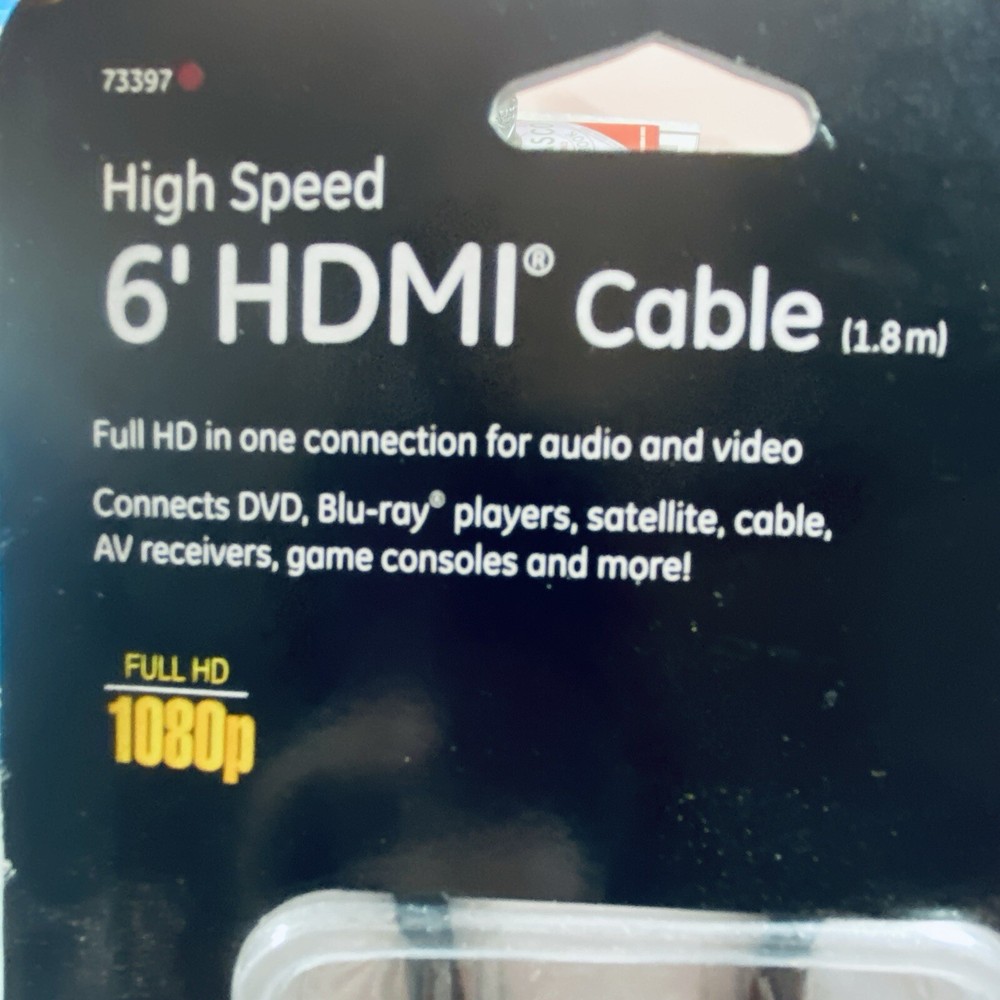 GE High Speed 6 Foot HDMI Cable Full HD to 1080p 10.2 Gbps 100% HDMI Compatible The GE High Speed 6 Foot HDMI Cable is designed to deliver Full HD quality up to 1080p resolution with a data transfer rate of 10.2 Gbps. It is 100% HDMI compatible and features a black color design. The cable has an HDMI connectors and a length of 6 feet, providing flexibility for connecting various devices such as TVs, gaming consoles, and multimedia players. This HDMI cable from GE ensures a reliable and high-quality connection for viewing content in high definition. See photos for the actual item available. Feel free to contact me with any questions. Shop our store with confidence as we offer 30-day returns on all purchases. Additionally you can save money by making multiple purchases to take advantage of our discount shipping policy. You will pay the highest shipping cost for a single item in your cart and $3 for each additional item.