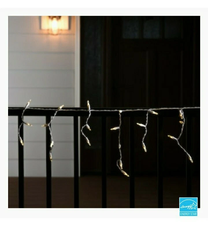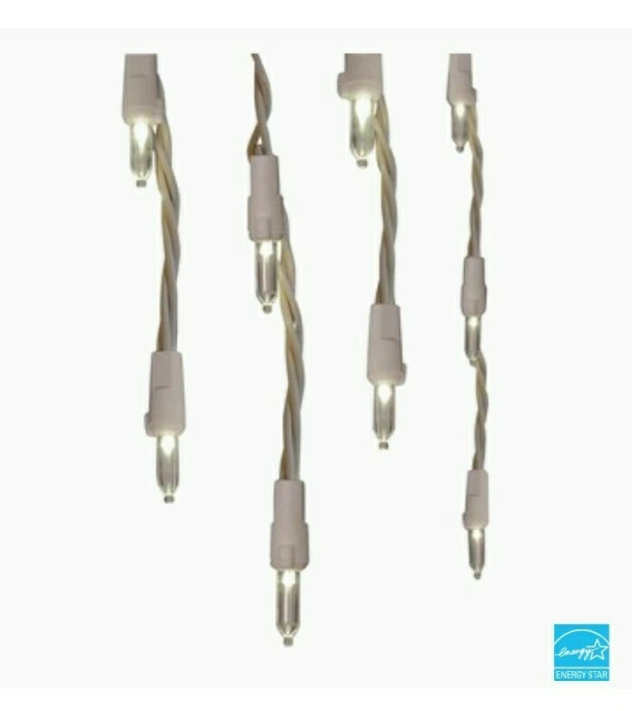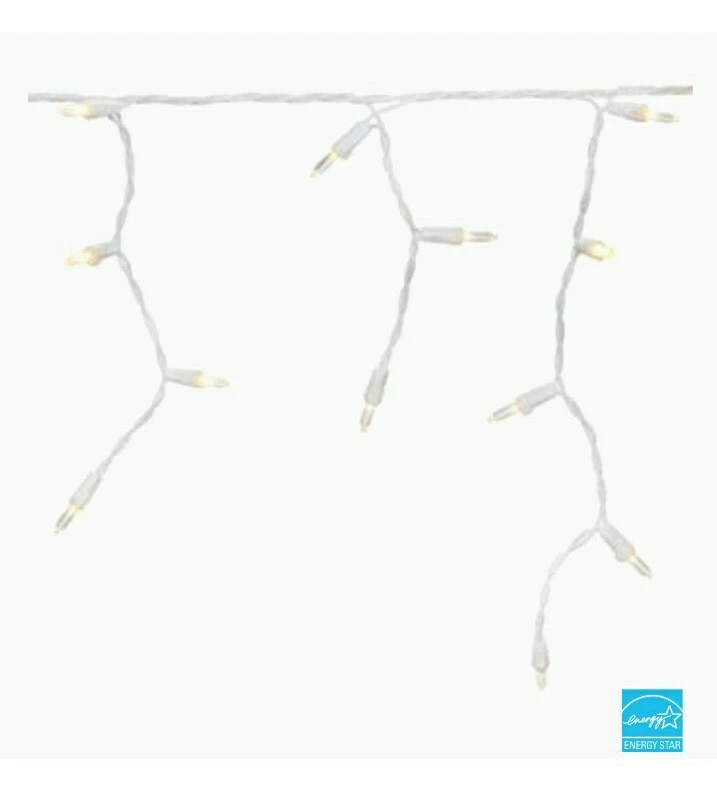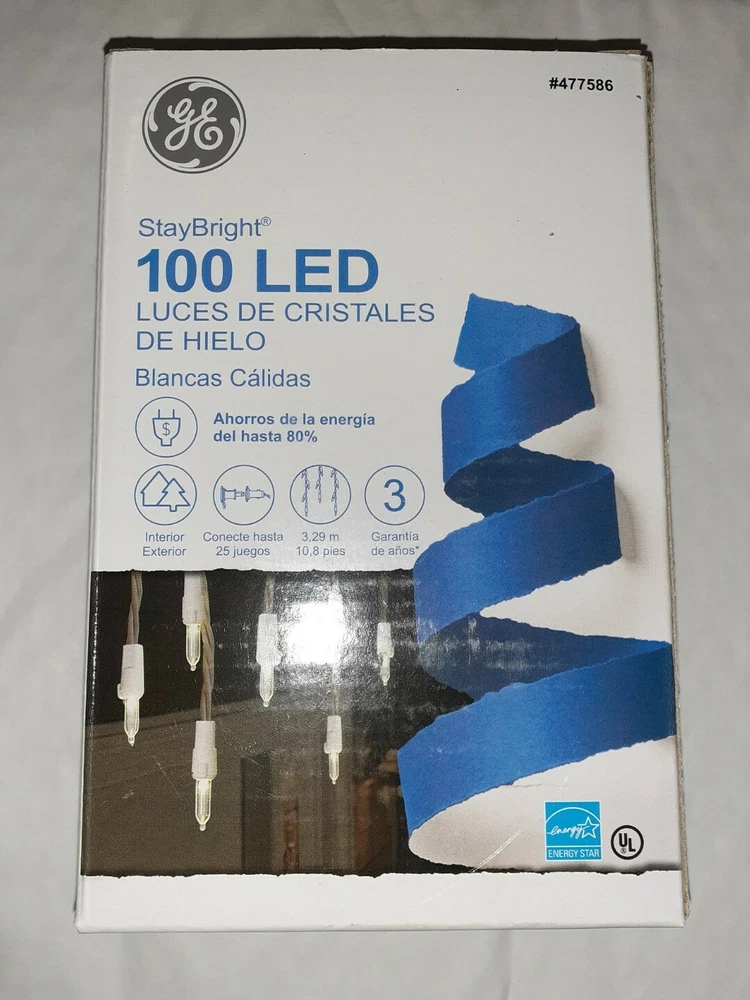 GE Staybright 100 LED ICICLE-STYLE LIGHTS, White Wire, New In Box. Condition is "New". Shipped with USPS Priority Mail. GE StayBright LED 100-count 5.5-MM warm white icicle light set with 3-in lead wire, 3-in bulb spacing, 5-in strand spacing, 3-in end connector plug, 10.8-ft lighted length, white cord with fused plug. Can connect up to 25 sets. ENERGY STAR rated. 100-Count GE StayBright LED warm white Christmas icicle lights White cord with 10.8-ft lighted length matches your Christmas decor and illuminates your home's interior or exterior Can connect with up to 25 sets to make decorating your home a breeze Replacement bulbs and fuses included for added convenience ENERGY STAR qualified products help you save money on utility bills without sacrificing performance, style or comfort UL safety listing demonstrates this product has met minimum requirements of widely accepted product safety standards