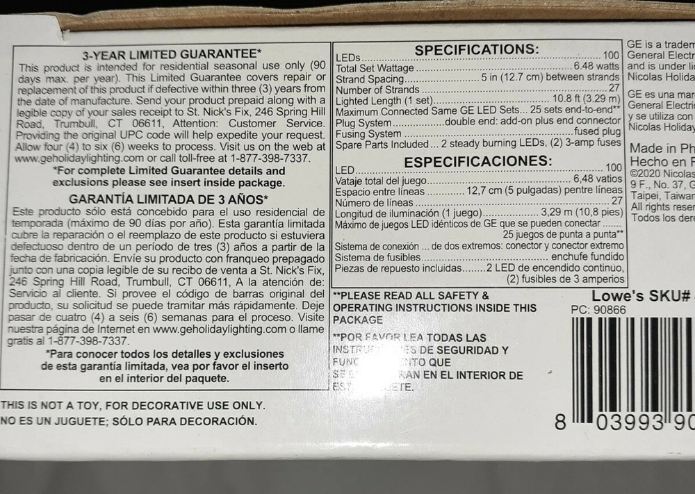 Installation Area: Indoor & Outdoor Type: Icicle Light Manufacturer: GE Item Length: 10.8 ft Brand: GE Country/Region of Manufacture: Philippines Light Color: Warm White Material: Plastic Theme: Holiday/Christmas Design: Icicle MPN: 477586 Year Manufactured: 2020 Features: LED Power Consumption: 6.48 watts Power Source: Corded Lighting Technology: LED Occasion: All Occasions, Chinese New Year, Christmas Cord Color: White Light Shape: Icicle Number of Lights: 100 Voltage: 120 V Color: White