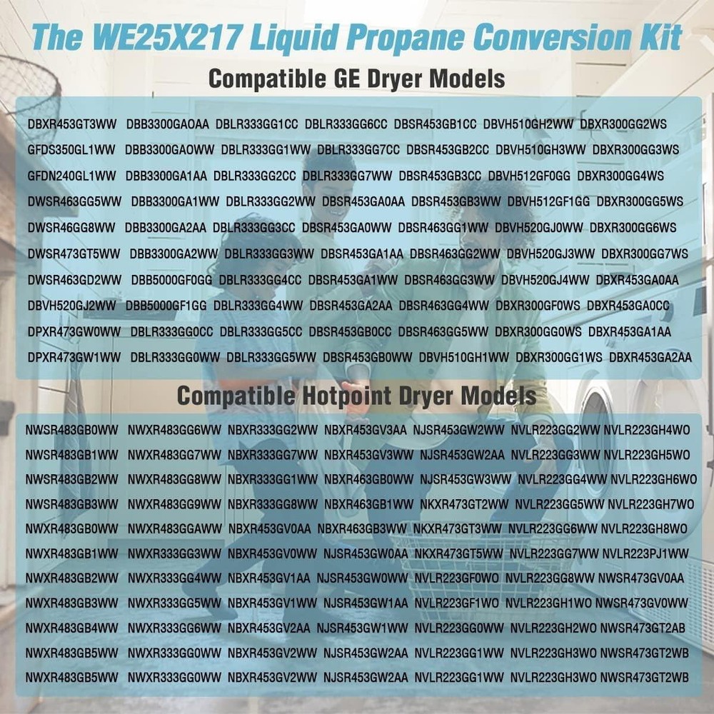 【Perfect Replacement】WE25X217 Dryer Natural Gas to LP (Liquid Propane) Conversion Kit. 【Widely Applicable】For use with all GE, Hotpoint, and RCA models (except international) type 1 clothes dryers using galve valve model 25M01A type 176, base part number 964D498G. 【Function】This Liquid Propane (Lp) Conversion Kit (Part Number We25x217) Is For Dryers. 【Premium Quality】This kit includes #55 LP Gas Orifice, Regulator Blocker, Conversion Rating Plate, Valve Conversion Decal, Responsibility Label, and Instruction Sheet.