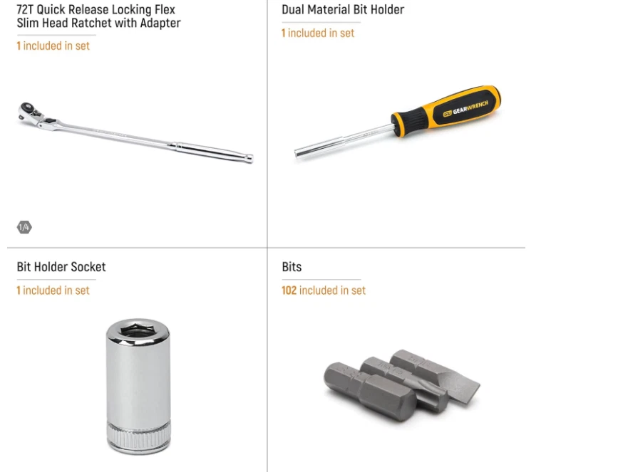 GEARWRENCH 105-Piece 1/4” Drive Slim Head Mechanics Tool Set in Foam Storage Tray 72-tooth ratchet turns fasteners with a 5°swing arc Multi-functional adapter head converts between bit driver and 1/4"" drive ratchet Locking flex-head has 9 positions for maximum access, with flush-mounted forward/reverse lever Slim line head design, 0.73” wide, 0.49” thick, for improved access Bits manufactured from S2 steel for strength and durability When you receive your order and have any queries or concerns about the product, feel free to message us. We guarantee 100% resolution for you. Our commitment is to provide high-quality products and exceptional customer service, ensuring your trust and satisfaction.