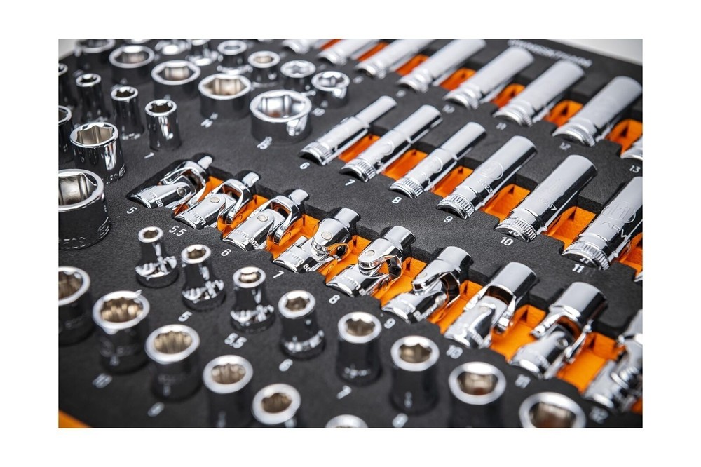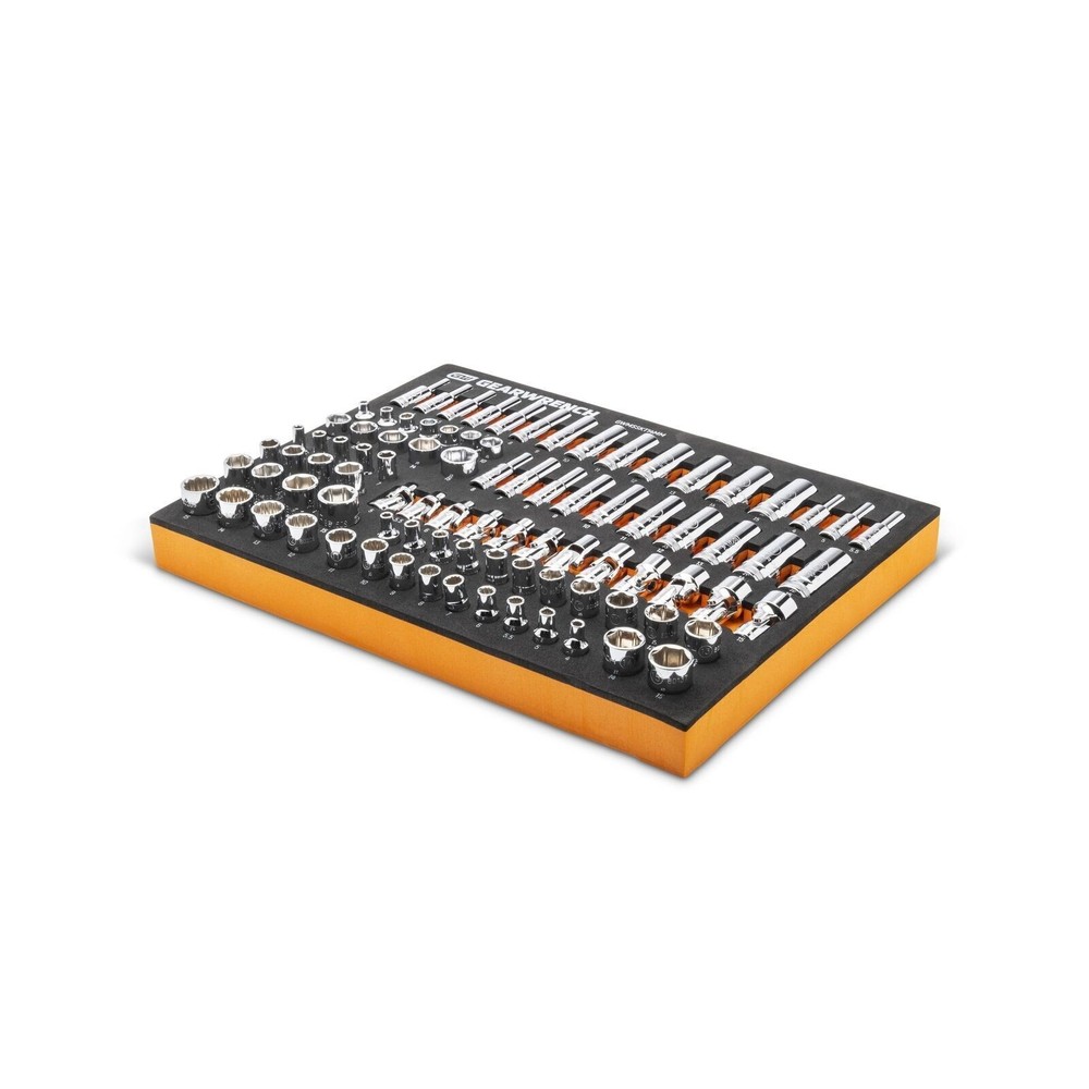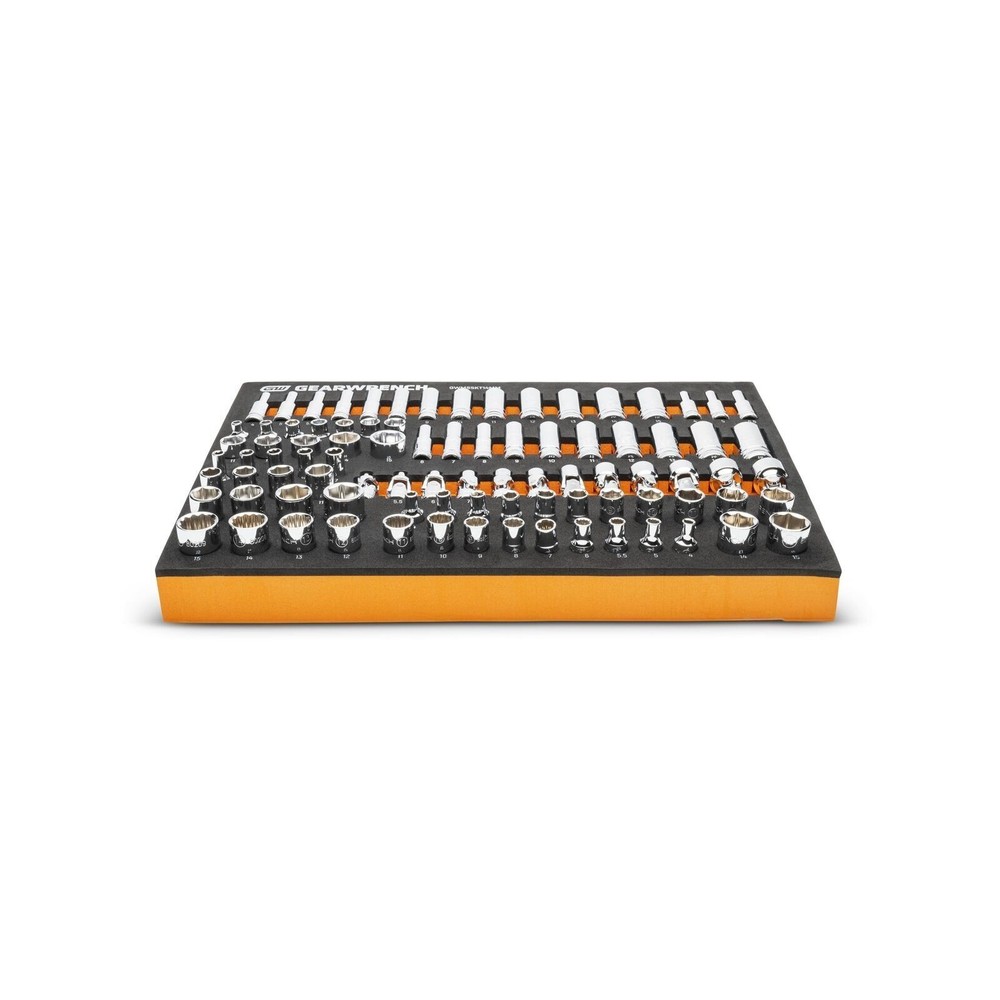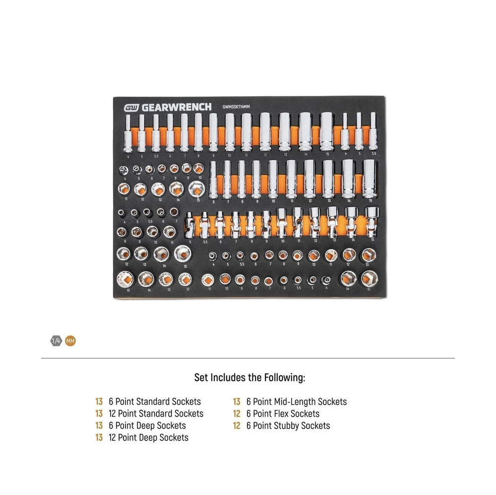 GEARWRENCH 89 Piece 1/4” Drive Master Metric Socket Set in Foam Storage Tray - GWMSSKT14MM Description GEARWRENCH mechanics tools have been designed with professional users in mind for better productivity, access, and strength. The 89 piece 1/4” drive master metric socket set in a foam storage tray is one of the wide collection of GEARWRENCH Modular Sets. These chemical and solvent resistant foam trays are designed to fit in a wide range of tool storage systems, including our GSX storage line of products. The foams are in contrasting orange and black with high visibility size markings for easy tool identification. Each of the tools fits in a custom cutout that provides optimal protection, organization, and accessibility. Features: Set includes 6 and 12 point sockets in standard and deep Off-corner loading design reduces fastener rounding Chamfered opening quickly guides fasteners into socket Serration depth inside the socket is as deep as the fastener hold it in the correct position Hard stamped size markings for easy identification Product Details: Manufacturer: Apex Tool Group Part Number: GWMSSKT14MM Item Weight: 5.16 pounds Product Dimensions: 14.88 x 10.47 x 2.01 inches Country of Origin: Taiwan Item model number: GWMSSKT14MM Size: One Size Style: 1/4" Chrome Sockets Power Source: hand_powered Item Package Quantity: 1 Number Of Pieces: 89 Compatible Fastener Range: 0.25 inches Included Components: MODSET 1/4" DRIVE SOCKETS MM, 89 PC Batteries Included?: No Batteries Required?: No Date First Available: September 19, 2023 On Oct 31, 2025 at 03:57:12 PDT, seller added the following information: On Nov 21, 2025 at 23:26:53 PST, seller added the following information: