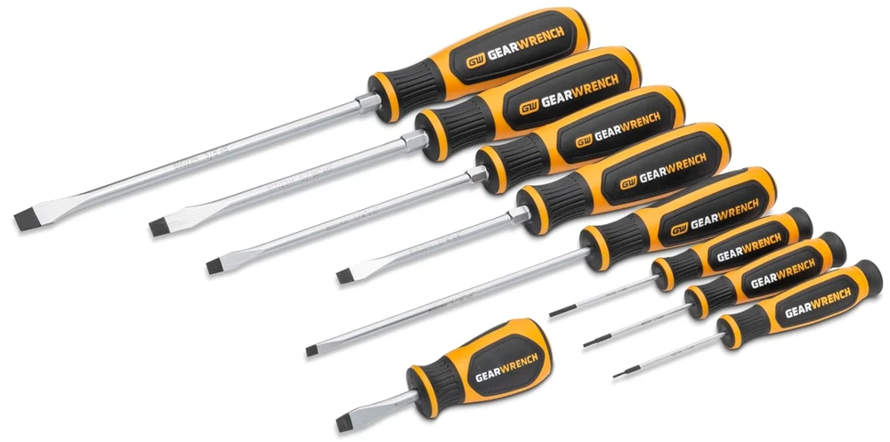 GEARWRENCH 9-Piece Slotted Screwdriver Set in Foam Tray - GWMSSCRSL Dual material handle offers a more comfortable grip and higher performance Non-slip black oxide tip for more secure fit in fastener Ergonomic tri-lobe dual material handle provides the optimal balance of strength and efficiency Full polish alloy steel screwdriver shaft prevents rust and corrosion “Speed Zone” handle design for faster rotation in low-torque applications When you receive your order and have any queries or concerns about the product, feel free to message us. We guarantee 100% resolution for you. Our commitment is to provide high-quality products and exceptional customer service, ensuring your trust and satisfaction.