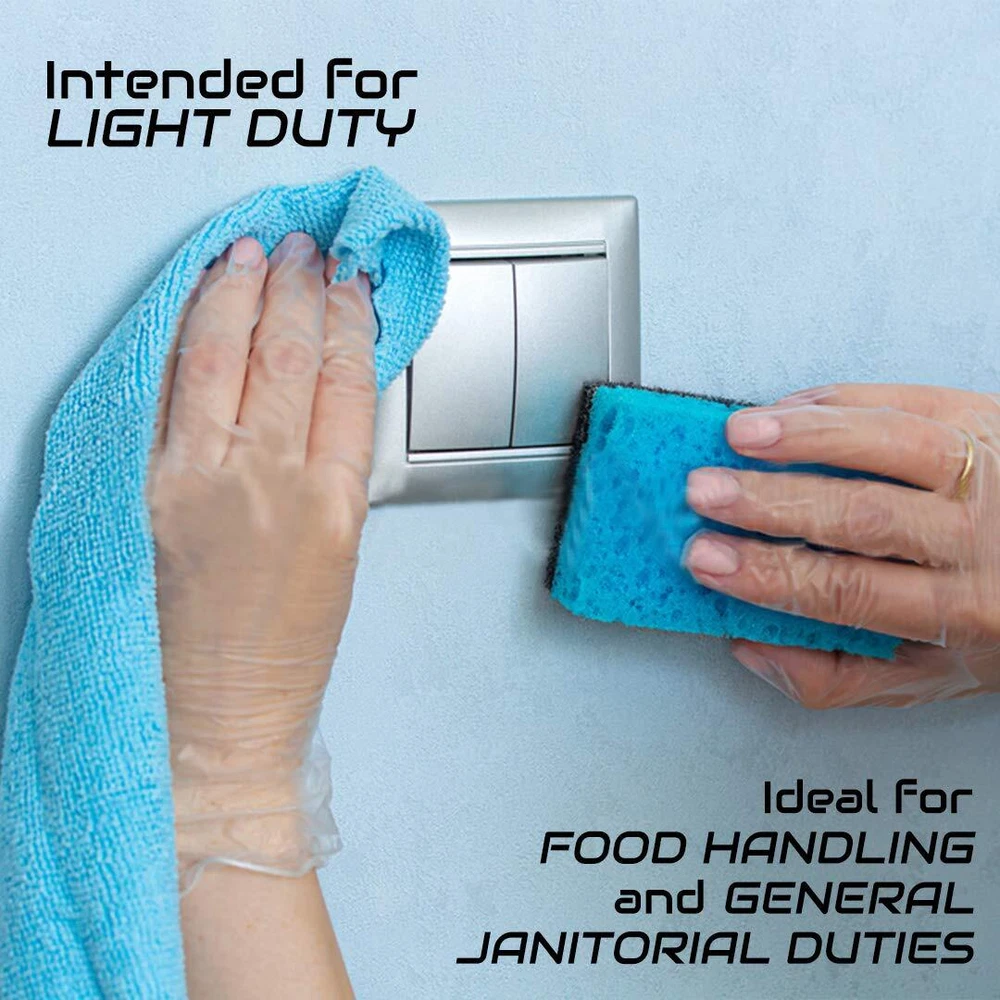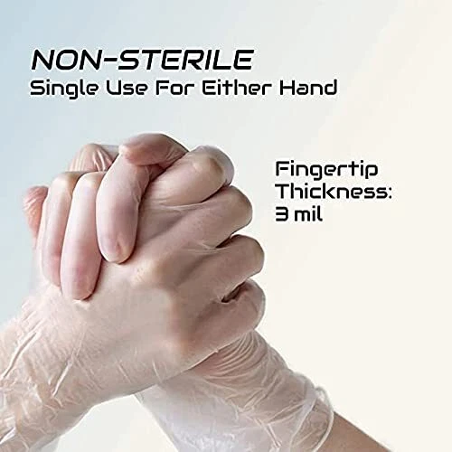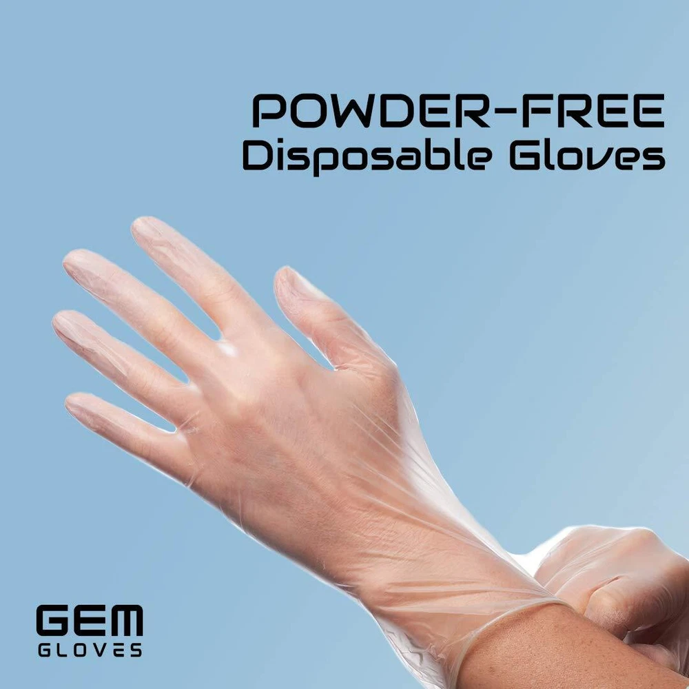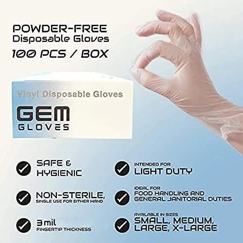 GEM Gloves are safe for a wide variety of business uses including: food handling and janitorial services. Supply your team with a premium quality vinyl glove at an affordable price. Our gloves are made of thick vinyl. They are perfect for hands of any size. Our glove sizes include Small, Medium, Large and Extra-Large so you can prove the proper fitting glove for your employees and staff members every time. GEM Gloves disposable vinyl gloves are perfect for light-duty tasks for ideal for tasks that require constant glove changing within your business. Our vinyl gloves are made from powder-free, latex-free poly material that is easy to slip on and off. Latex-free disposable gloves are ideal for those allergic to natural rubber latex. Our clear disposable gloves are a great fit for medical, lab work, food service, hair salon, janitorial, and other light industrial applications. Powder Free Disposable Gloves, Safe & Hygenic Non-Sterile, Single Use Either Hand Fingertips Thickness: 3 mil 100 pcs/box Light duty, ideal for basic food handling, general janitorial Length (Finger Tip to Wrist): 9 in (Stretchable) Width (Wrist): 4 in (Stretchable) Width (Thumb to Pinkie): 6 in (Stretchable)