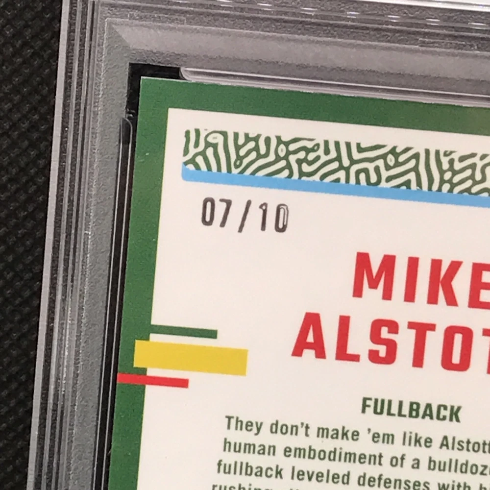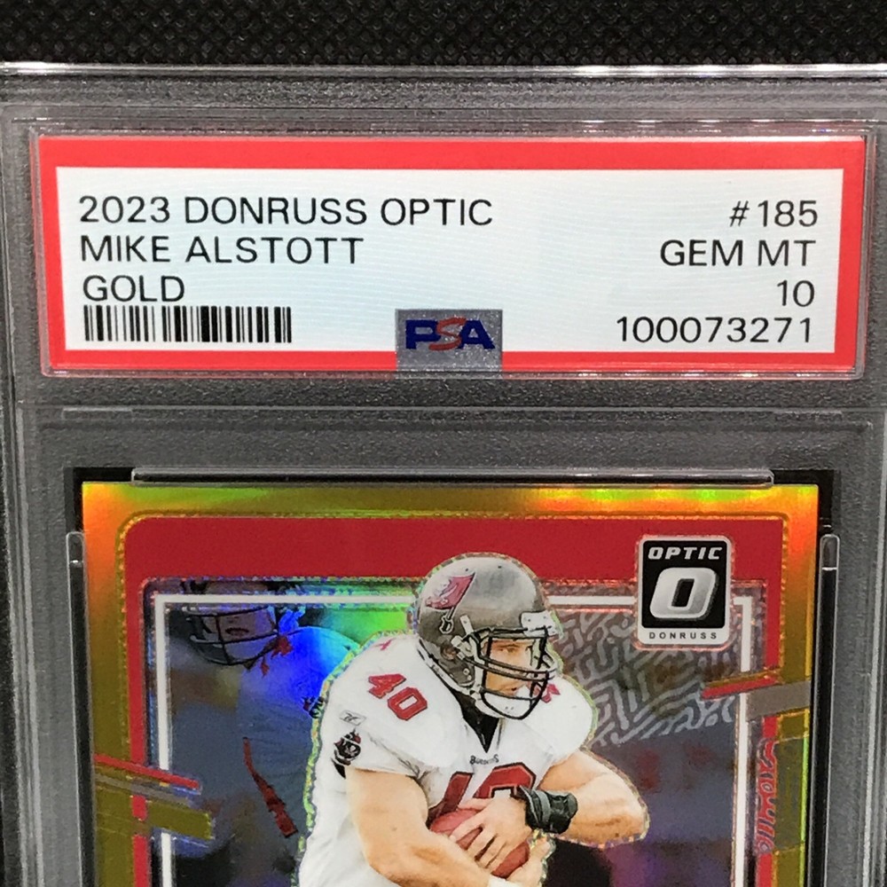 This is a rare and valuable sports trading card featuring Mike Alstott, a former player for the Tampa Bay Buccaneers. The card is part of the 2023 Panini Donruss Optic set and has a gold prizm parallel/variety, making it a highly sought-after item for collectors. It has been professionally graded by the Professional Sports Authenticator (PSA) and has a perfect grade of 10. The card is also serial numbered, hologrammed, and is a short print, making it an even more exclusive and valuable addition to any collection. This card is a must-have for any NFL or sports trading card enthusiast.