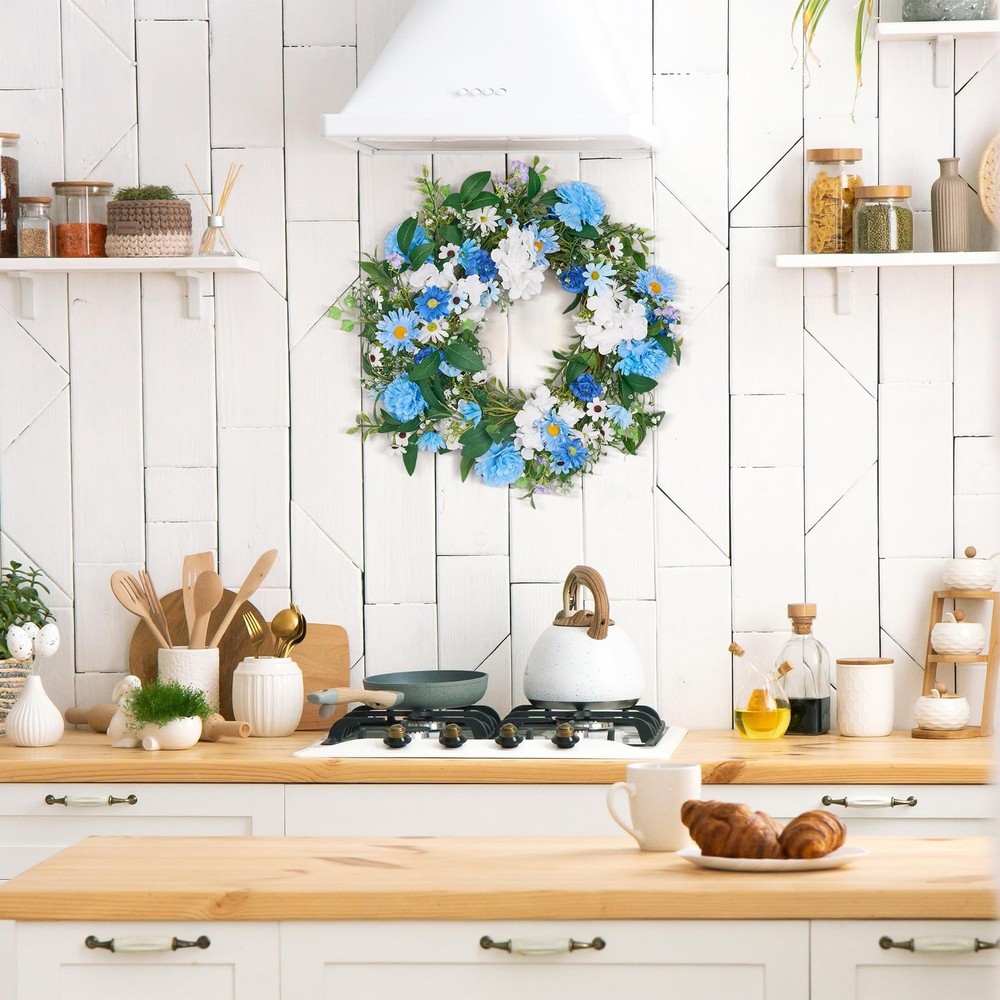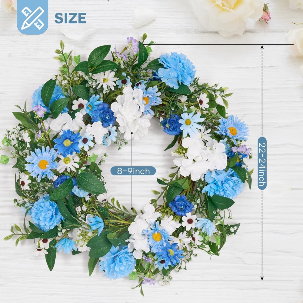 GENMOUS 24 Inch Summer Spring Blue Daisy Wreath for Front Door, Rustic and Farmhouse Flower Wreath with Myosotis sylvatica, Indoor&Outdoor Wedding Wall Home Decor Product Details Color: Daisy Brand: GENMOUS & CO. MPN: Does not apply UPC: Does not apply EAN: Does not apply Color: Daisy Brand: GENMOUS & CO. Material: Natural Foliage and Flowers Shape: Round Product Dimensions: 24"D x 24"W x 3"H Manufacturer: GENMOUS & CO. Product Dimensions: 24 x 24 x 3 inches Item Weight: 1.76 pounds Manufacturer: GENMOUS & CO. Country of Origin: China Date First Available: November 25, 2024 Charming Blue Flower Wreath: This front door wreath features a delightful mix of light blue Daisy, Myosotis sylvatica, Lisianthus, Gypsophila paniculata and Ivy leaves combined with soft, touchable leaves. The combination creates a lush, life-like appearance that adds a touch of elegance to any space. Generous Size & Full Appearance: With an outer diameter of 24 inches, this large and leafy flower wreath is perfect for making a statement. It's ideal for decorating front doors, back doors, windows, and yards, offering a full and luxurious look. Versatile Decor for Special Occasions: Whether you're planning a romantic spring or summer wedding, party, or simply want to enhance your home decor, this blue wreath is a versatile choice. It can be hung on doors, windows, walls, chairs, and cars, making it perfect for weddings, celebrations, and everyday beauty. Rustic & Farmhouse Style: The spring wreath's rustic and farmhouse design ensures it complements various home decor styles, from wooden doors to metal finishes. Its coastal flair adds a touch of elegance, making it a charming addition to any room or outdoor space. Easy Care & Long-Lasting Beauty: Made from high-quality, durable materials, this summer door wreath requires minimal maintenance. Simply fluff it to shape before hanging and keep it indoors or in covered outdoor areas to preserve its freshness and color for years to come.
