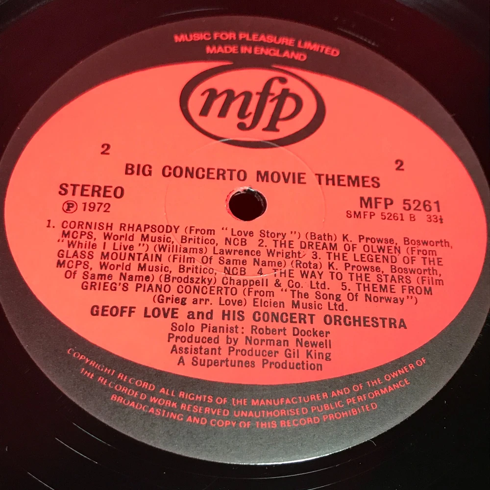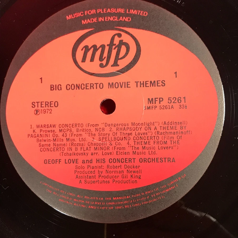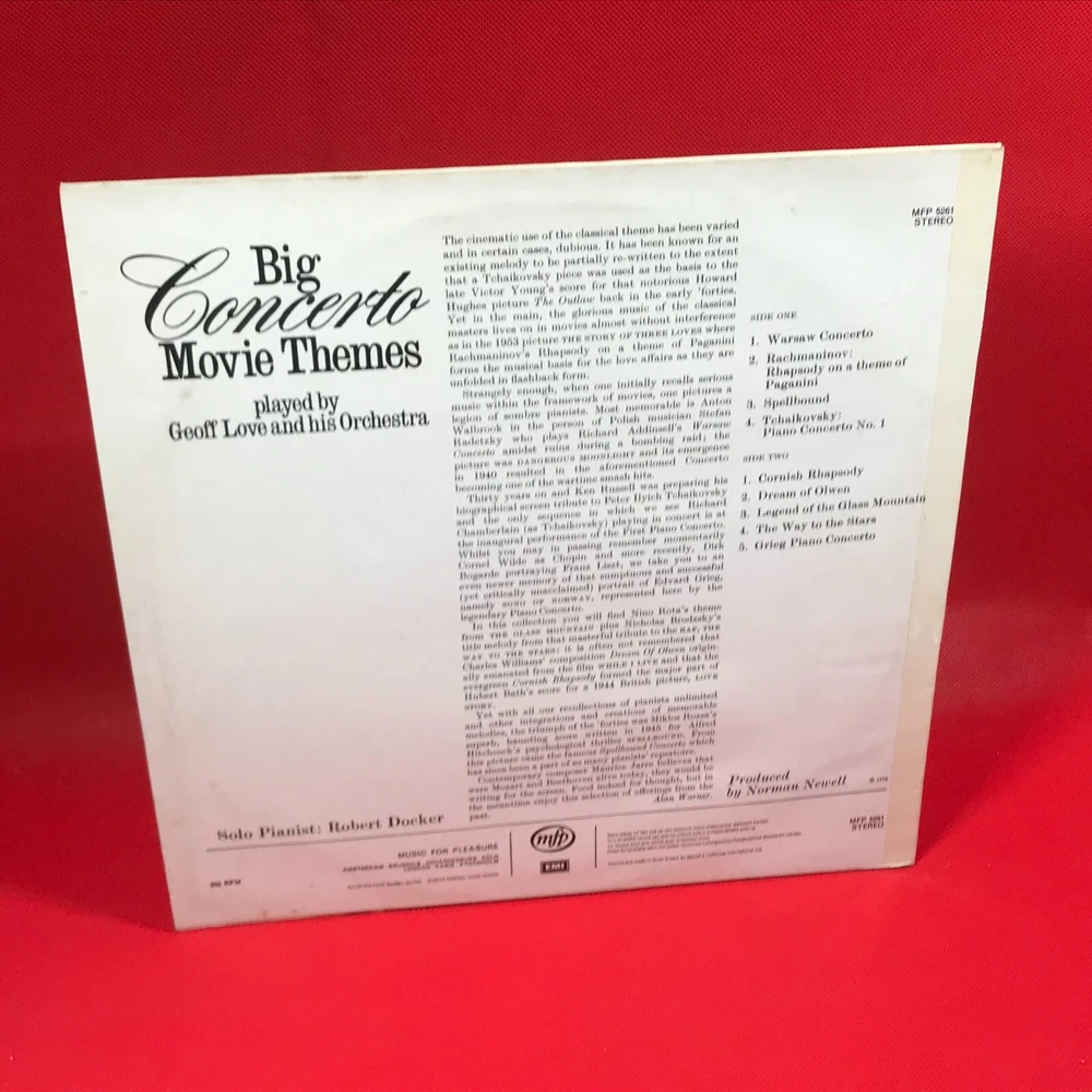 GEOFF LOVE AND HIS ORCHESTRA Big Concerto Movie Themes - 1972 UK Music For Pleasure vinyl LP, MFP 5261 Warsaw Concerto Rachmaninov: Rhaspody On A Theme Of Paganini Spellbound Tchaikovsky: Piano Concerto No.1 Cornish Rhapsody Dream Of Olwen Legend Of The Glass Mountain The Way To The Stars Greig Piano Concerto Record Condition : Excellent Sleeve : Minor shelfwear (see photo) Please check out our other items !