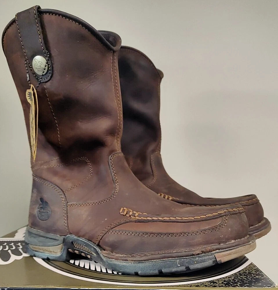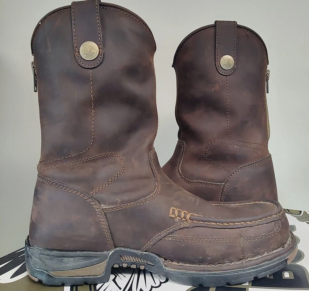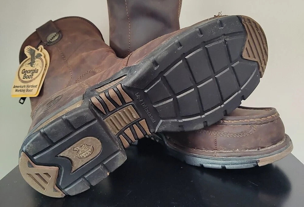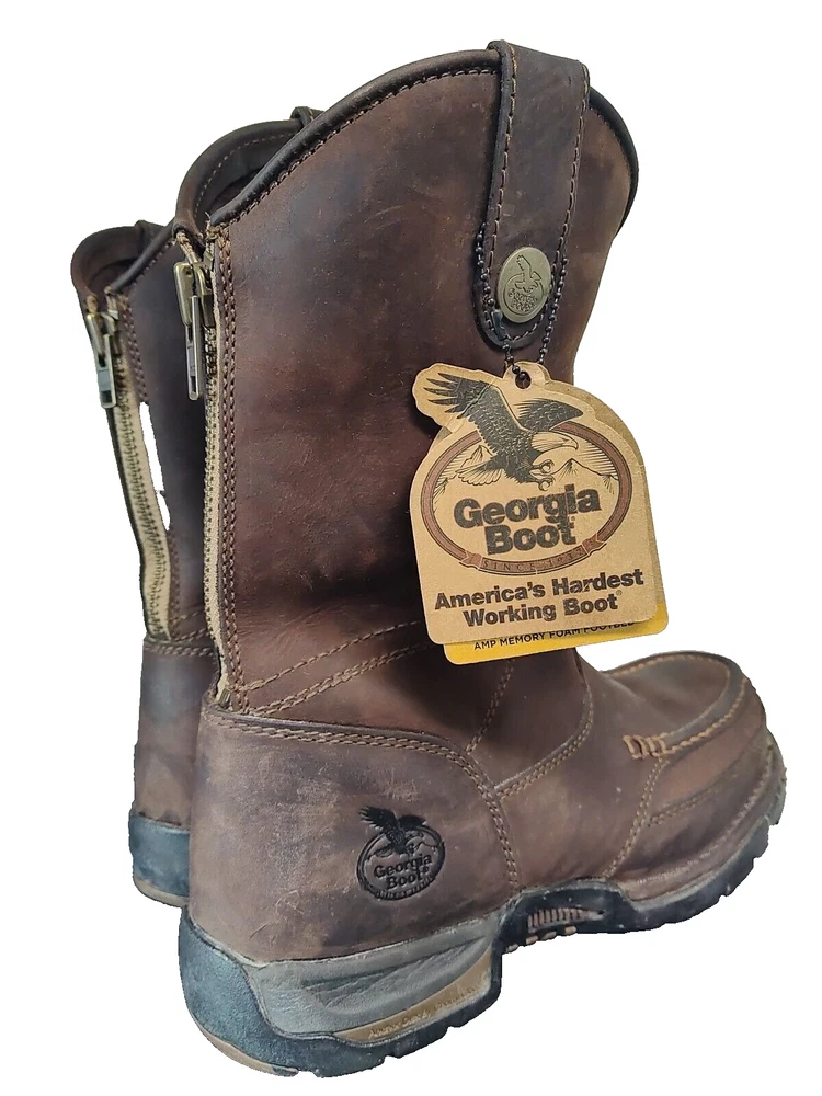 GEORGIA BOOT GB00226 MEN'S ATHENS PULL-ON WORK BOOT-- SIZE 11W--DARK BROWN **Please see pictures for any nicks/scuffs/cuts/separation. ** Please message me with any questions. Unlined Full-grain leather upper Rubber outsole with EVA midsole AMP (Advanced Memory Polyurethane) insole Anchor Disk by Georgia - provides added heel support TPU shank 11 Inches in height Shaft height and circumference may vary by size 14-inch calf circumference Moc toe ASTM F2892 electrical hazard standard 1 1/2" heel Weight: 1.5LB PER shoe Back zipper for easy on/off 3/4 Stitch out construction for added flexibility