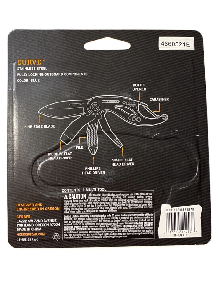 The GERBER Curve Multi-Tool is a compact and versatile tool designed for everyday carry. It features 6 tools in 1, including a carabiner, bottle opener, file, Phillips screwdriver, small flat head screwdriver, and a fine edge blade with a length of 1.25". The tool is made of stainless steel, ensuring durability and corrosion resistance. Its blue color and lightweight design make it convenient to carry on a keychain or in a pocket. Perfect for camping, hiking, or general outdoor activities, this multi-tool offers functionality in a small and portable package. Visit our page to view more great deals on the brands you love! All things farm house, western, outdoors, pet supplies and more!