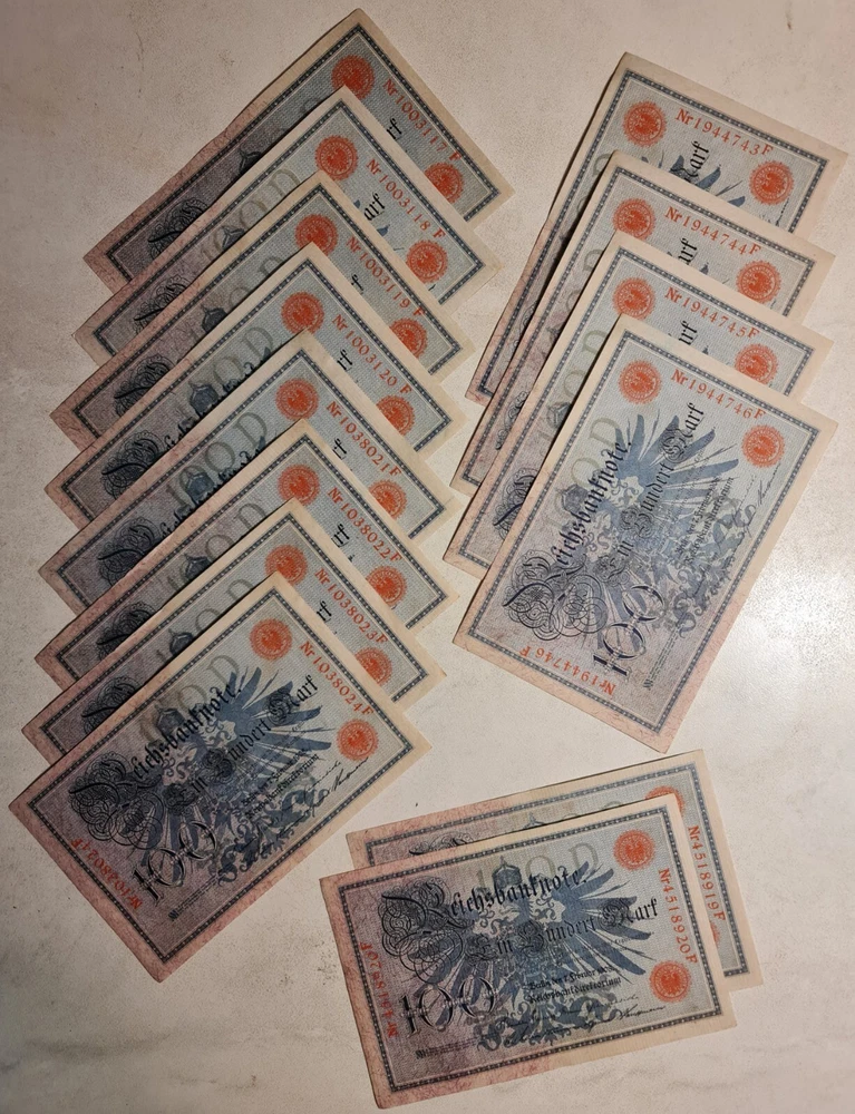 Germany. 1908 100 Mark. Lot of 14 Banknotes. P-33a. Shipping by registered mail 7$.