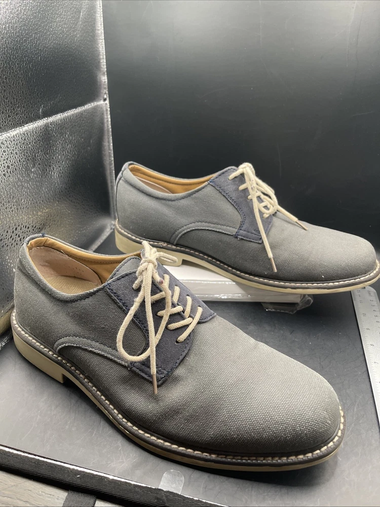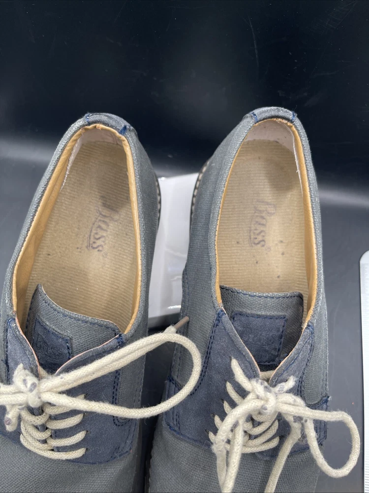 The shoes are medium shade grey with navy blue New shoe laces recommended The material feels like fabric They look dirty in the pictures from the lighting, I assure you they are not Nonsmoking home