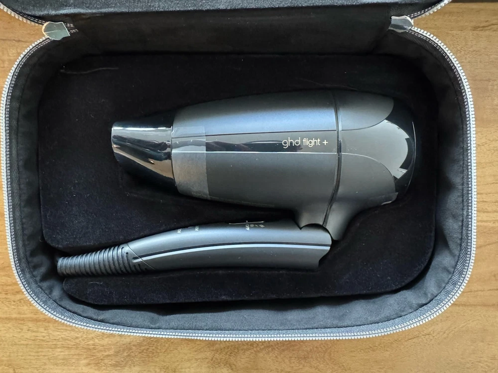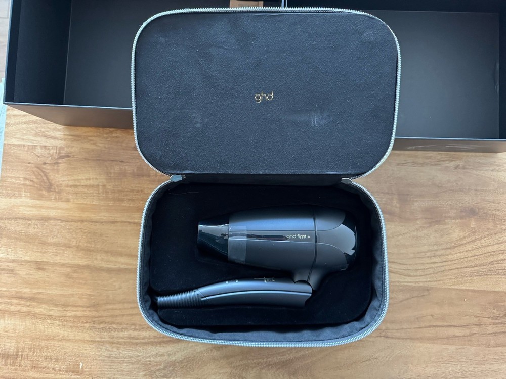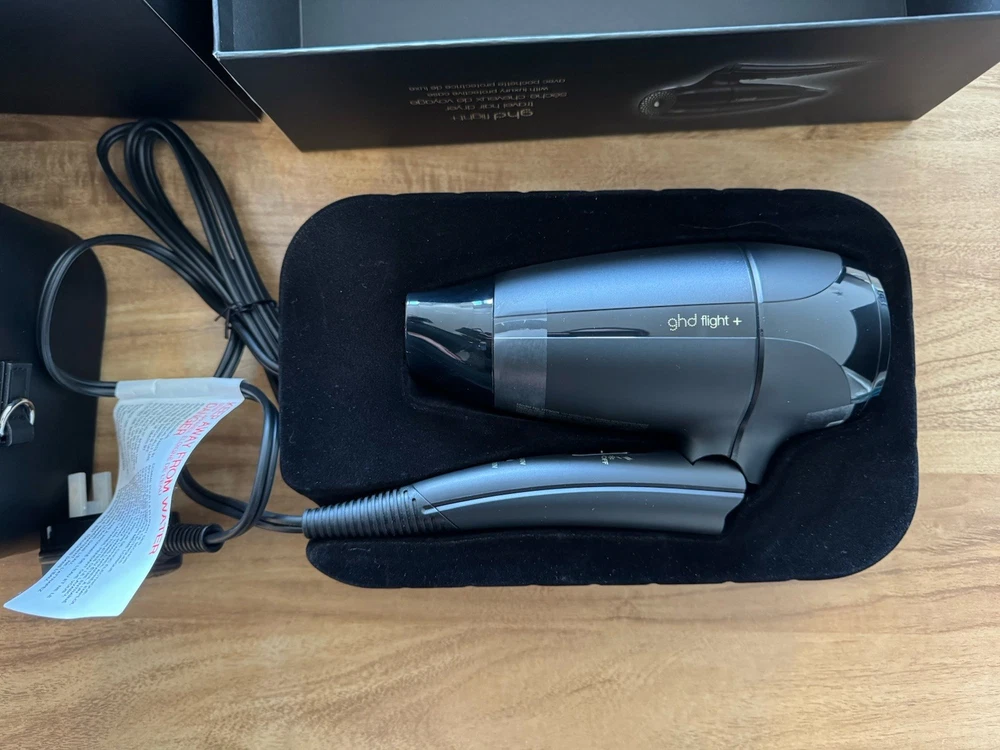 ghd Flight+ Travel Hair Dryer ― Dual Voltage 1300w Professional Portable Hair Volumizer, Suitcase Friendly, Lightweight, Powerful, and Compact Blow Dryer with Luxurious Travel Case ― Black. Never used. You’ll receive the item exactly as shown in the photos.
