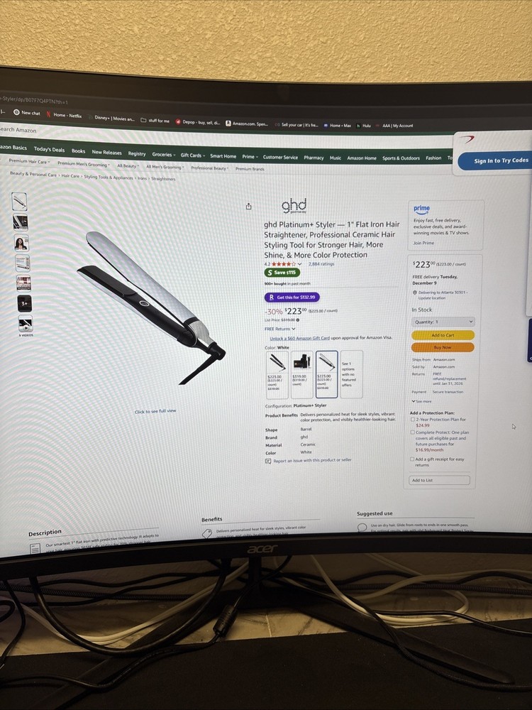 The GHD Platinum+ 1" Flat Iron Hair Straightener is a high-quality styling tool designed for all hair types. With its ceramic white barrel and maximum temperature of 365°F, it provides smooth and sleek results. Heats up very fast like new. Missing box.