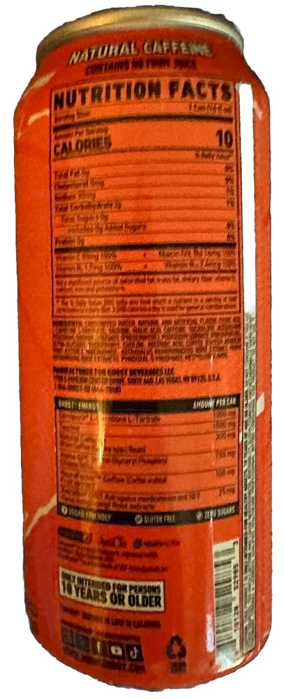 This is a limited-time flavor of Ghost Energy drink in the Peach flavor. The can is unopened and ready to ship quickly. The design features a multi-color scheme with the brand Ghost prominently displayed. Created in 2025 in the United States, this energy drink is sure to appeal to collectors and fans of unique beverage offerings.