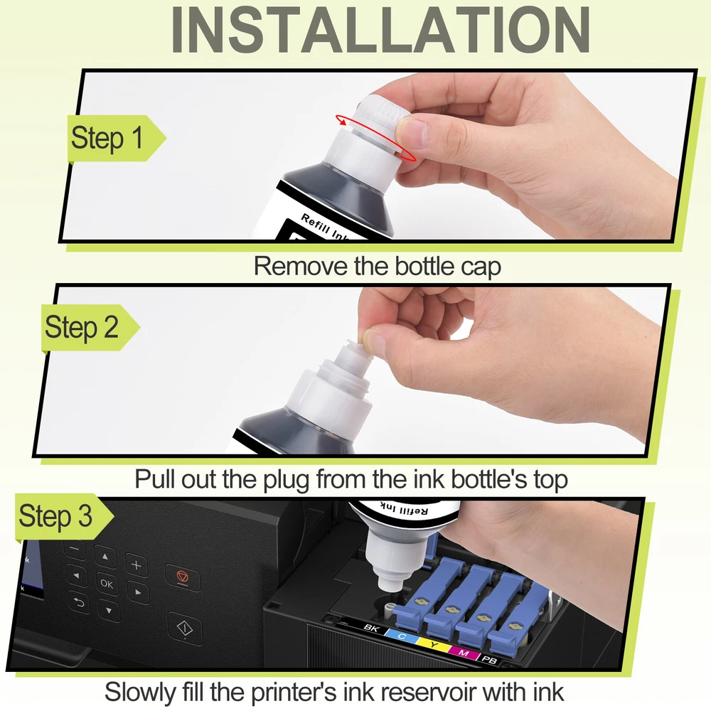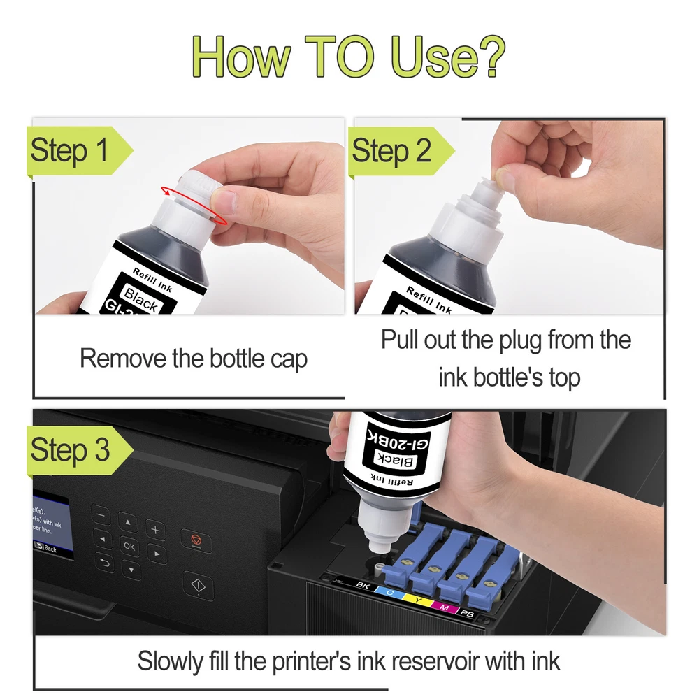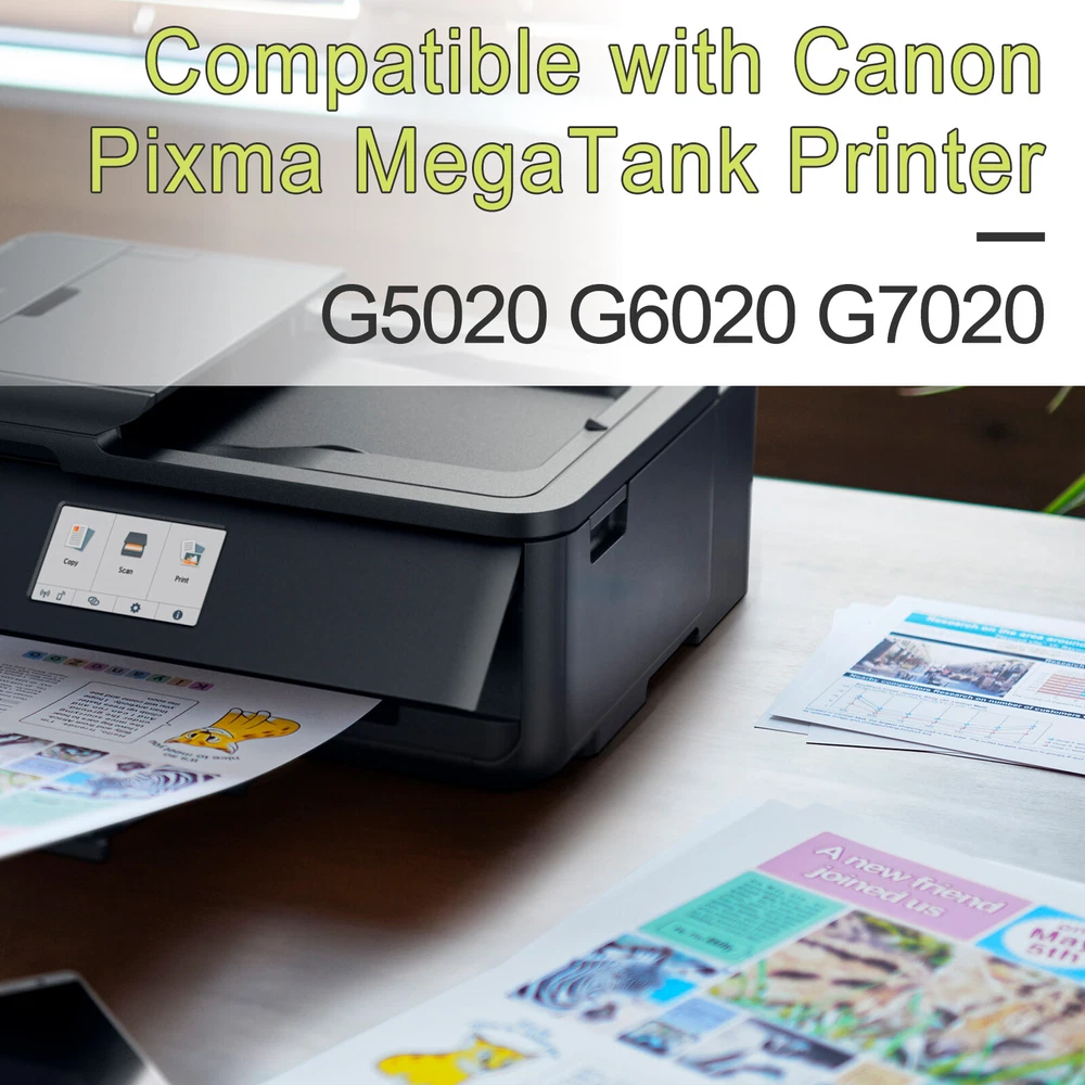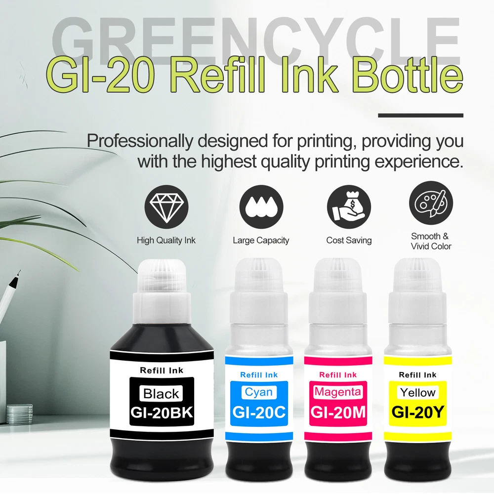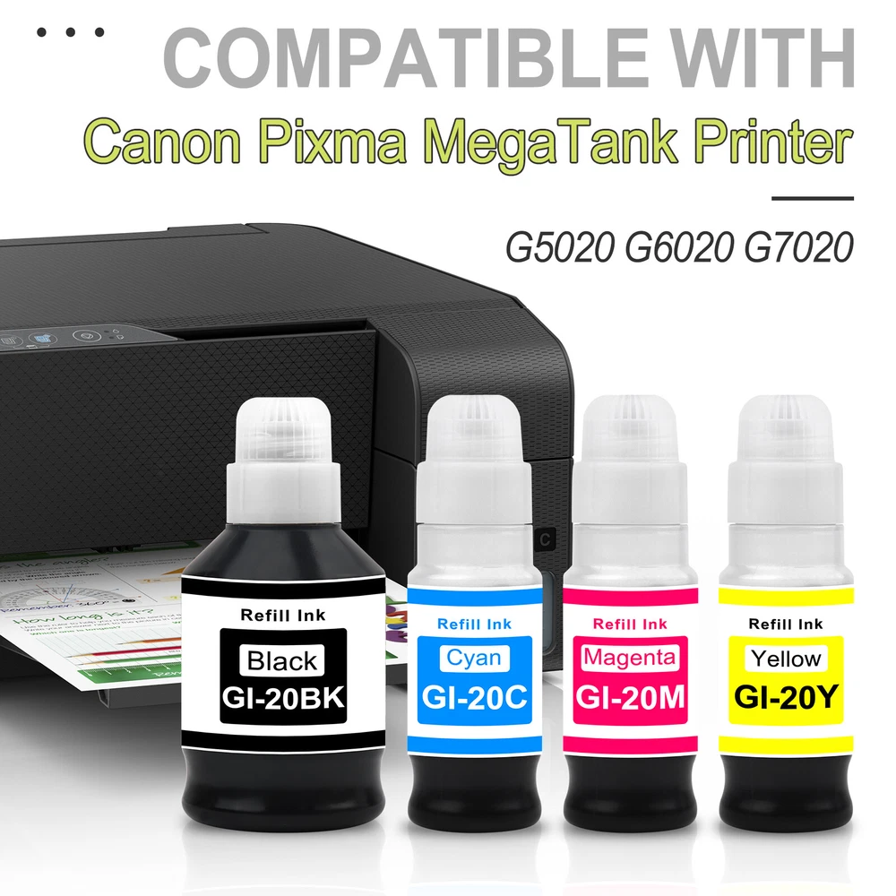 ✅Compatible for Canon G6020 Printer, G7020 Printer, G5020 MegaTank All-in-one Printers; Replacement for Canon G6020 ink; Replacement for Canon G7020 ink; Replacement for Canon G5020 ink. ✅Page Yield: 8,300 pages per compatible GI 20 ink bottle black, 7,700 pages per compatible GI 20 color ink bottle. (at 5% coverage on A4 paper) ✅Feature: Easy to take and refill, work the same way as OEM product. Vivid colors, fade resistant, quick dry, no plug, consistent printing. Suitable for many kinds of paper, such as high glossy inkjet photo sticker paper. Double protection: the transparent top cover make the ink no leak, the bottle mouth is sealed with aluminum film to ensure that the ink will not leak during transportation.