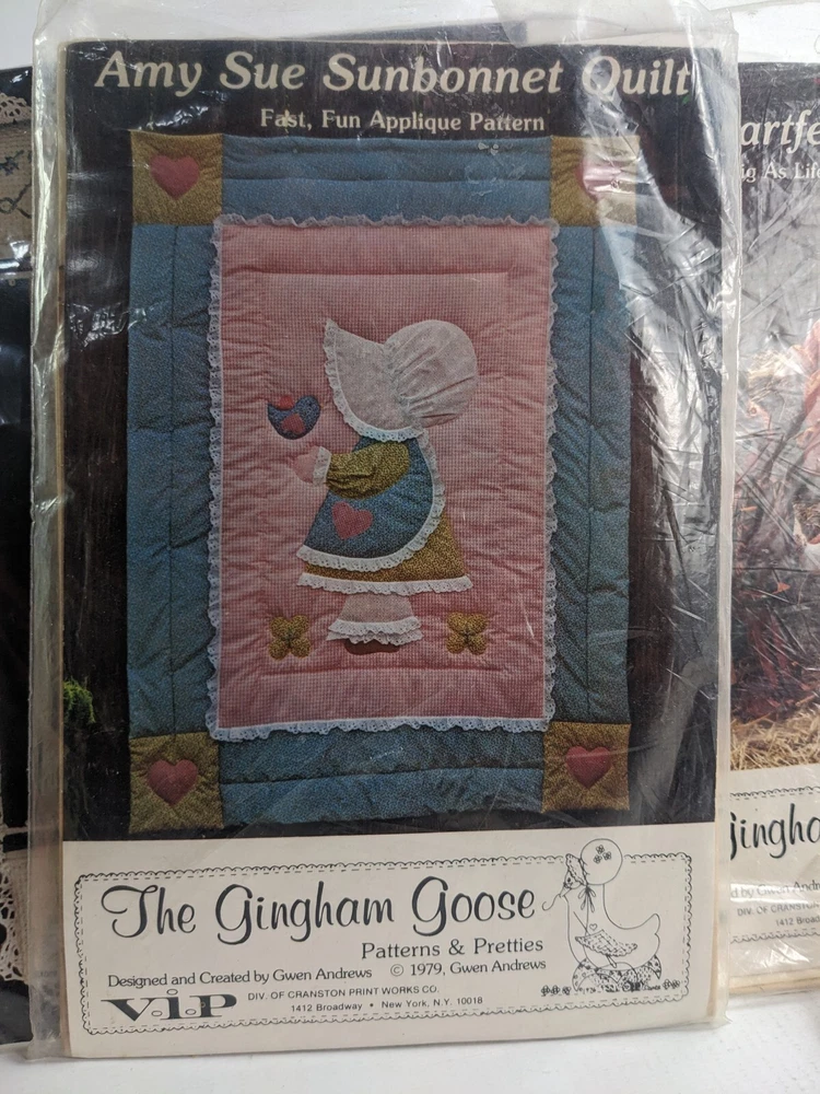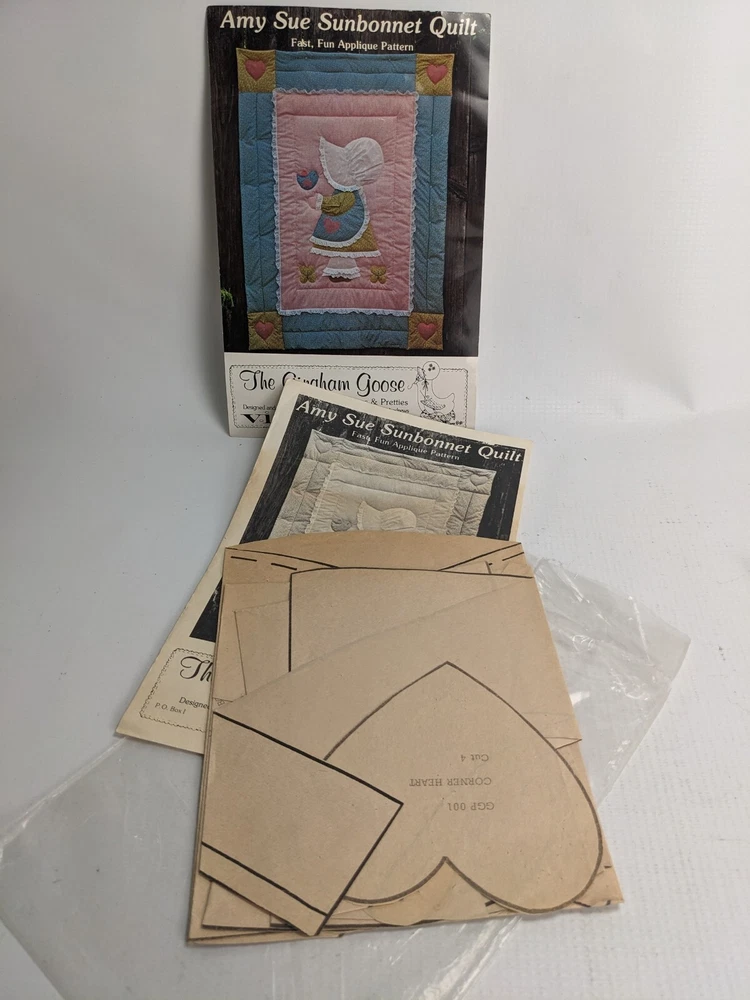 Vintage Gingham Goose Baby Quilt Sewing Pattern Amy Sue Sunbonnet Quilt 1976 Envelope contains the patterns and instructions to make an "Amy Sue Sunbonnet" baby crib quilt measuring 42" by 58". A list of required fabrics and supplies is provided on the back. Cut, used pattern