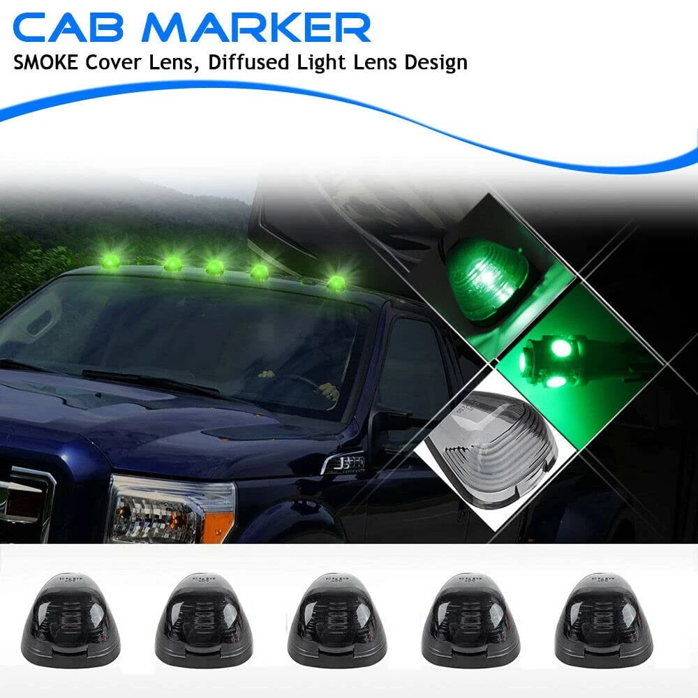 This Cab Roof Running Marker Light Set Complete Kit Compatible with 1999-2017 E150 E250 E350 E450 E550 F150 F250 F350 F450 F550 Super duty pickup truck with stock cab marker lights. Also Compatible with 2017 2018 E350 E450 Super Duty Trucks. (Do NOT fit 2017 2018 F250 - F550); Application: Cab Marker, Cab Marker Clearance Light, Roof Running Light, Roof clearance lights. Interchange Part Number: 8C34-15442-CB 8C34-15442-AD; 264143AM Lens Material: High quality: Every cab marker Lights kit features very strong ABS plastic lens and will not be fade from long time exposure to sunlight and weather elements; soft pads included, fit for fast feet or curved roofs Bulb size: 4 x 3" x 2"; Base size: 3.95" x 2.8" (LxW); Hole to hole distance: 1.7". Pack Includes: 5x Smoked Roof Cab Marker Lights with 5 bases (Assembly Kits) + 5x Green T10 194 168 LED Bulbs