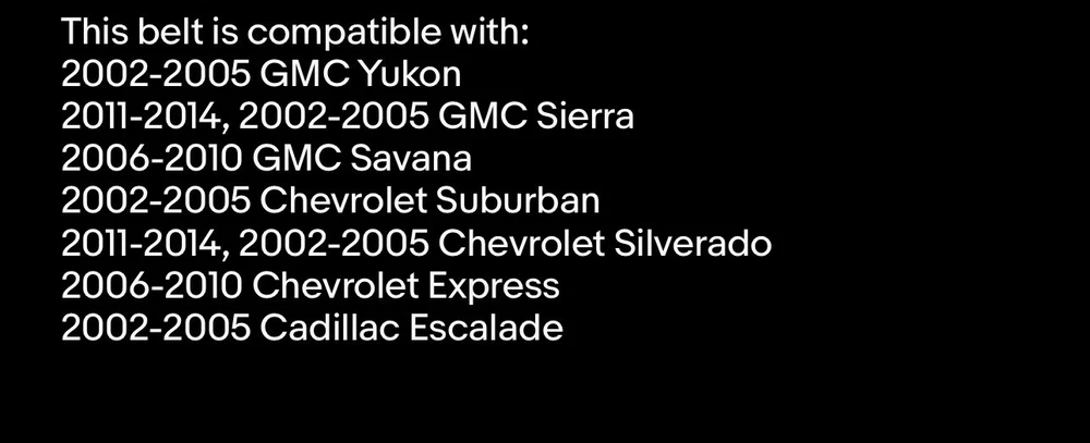 This GM Genuine 12642433 V-Ribbed Serpentine Belt is a high-quality replacement part for your vehicle. It is designed to fit GM 2002-2014 models and is made with durable materials that ensure long-lasting performance. The brand of this part is GM, and the manufacturer part number is 12642433. This accessory belt is perfect for those in need of a replacement belt for their car or truck. It is compatible with a variety of GM models and is designed to fit perfectly, ensuring maximum performance and reliability. If you are looking for a replacement part for your vehicle, this GM Genuine 12642433 V-Ribbed Serpentine Belt is an excellent choice. This belt is compatible with: 2002-2005 GMC Yukon 2011-2014, 2002-2005 GMC Sierra 2006-2010 GMC Savana 2002-2005 Chevrolet Suburban 2011-2014, 2002-2005 Chevrolet Silverado 2006-2010 Chevrolet Express 2002-2005 Cadillac Escalade