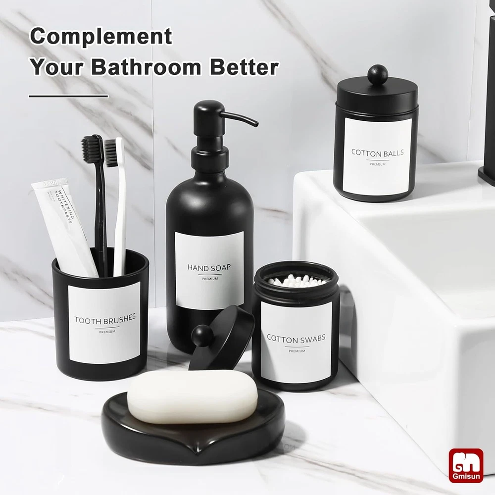 Glass 【ATTRACTIVE 5 PACK BATHROOM ACCESSORIES SET COMPLETE】 Get these elegant additions to your bathroom right now! Let these matte black glass bathroom accessory set brighten your bathroom nicely! These bathroom accessories sets are perfect for every bathroom theme no matter boho, modern, farmhouse, vintage, and western, you name it! You would get a SOAP DISPENSER, a TOOTHBRUSH HOLDER, a COTTON SWAB HOLDER, a COTTON BALL HOLDER, a SOAP DISH, and 6pcs Labels in just ONE set! 【EXQUISITE BLACK CLASS MATERIAL】All these black glass bathroom accessories sets complete are made of high-quality no lead glass. Elegant, sturdy, and heavy-weighted. Not easy to be broken or tip over. Let those plastic or resin inferior bathroom accessories decor leave your bathroom, and let this bathroom soap dispenser and toothbrush holder set complement your bathroom vanity decor. 【EXQUISITE BLACK CLASS MATERIAL】All these black glass bathroom accessories sets complete are made of high-quality no lead glass. Elegant, sturdy, and heavy-weighted. Not easy to be broken or tip over. Let those plastic or resin inferior bathroom accessories decor leave your bathroom, and let this bathroom soap dispenser and toothbrush holder set complement your bathroom vanity decor. 【PRACTICAL FOR USE】If you are a person who loves enjoying your life, you would find that this bath accessories sets for bathroom meets all your daily needs in your life. 16oz Soap dispenser filled with hand soap/lotion/face wash could be used for a long time. Toothbrush holder could hold multiple toothbrushes, toothpaste, combs, and shavers. Two jars could be used for qtips, cotton balls, cotton swabs. Soap dish could help you place your soap better. Makes your bathroom look tidy and wonderful. 【WONDERFUL GIFT IDEA & SUPERIOR QUALITY SERVICE】This bathroom soap dispenser and toothbrush holder set is a great and unique gift for housewarming, wedding, birthday, Mother's Day, Thanksgiving Day for mom, sister, colleague, and friends. We provide 100% product quality guarantee, the fastest, and the best service to ensure your satisfaction. Please let us know if you have any questions.