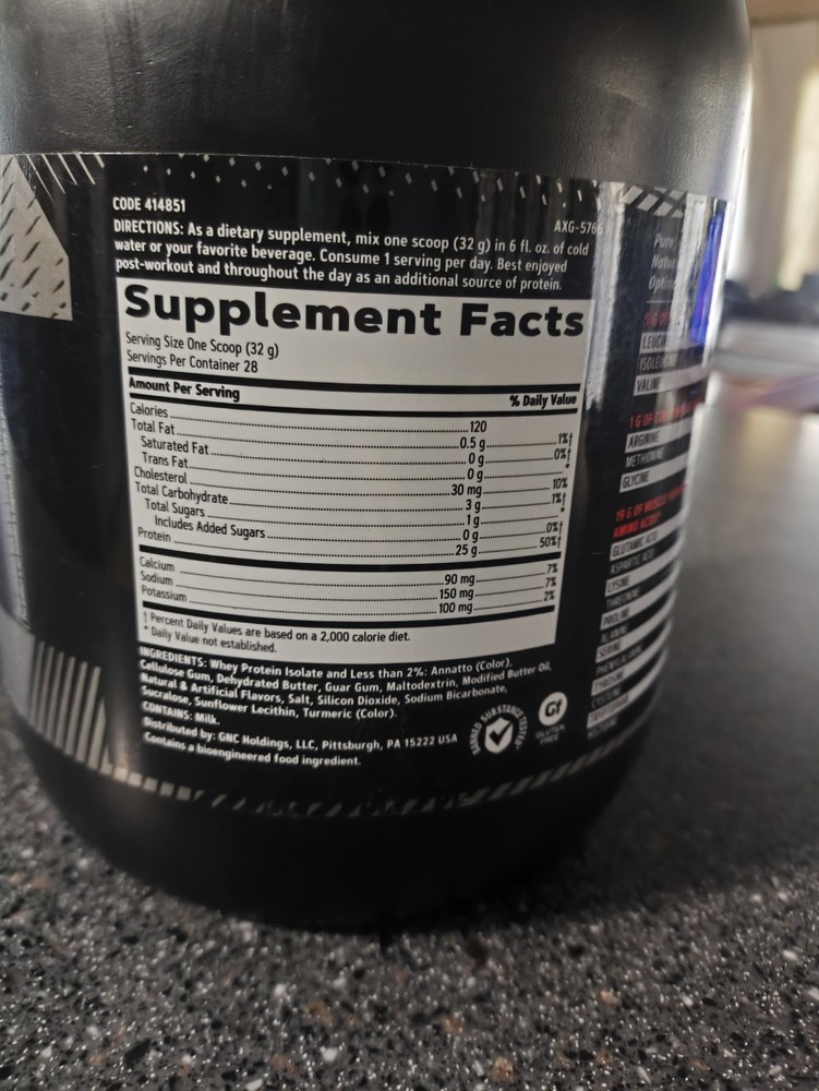 Supply:1 Month and LongerWhen to Take:Before WorkoutMPN:vanilla custardExpiration Date:05/2025Flavor:ChocolateMain Purpose:Gym & TrainingType:Whey ProteinIngredients:ProteinBrand:GNCActive Ingredients:ProteinFeatures:Gluten-FreeFormulation:PowderCountry of Origin:IndiaDosage:20 mgDepartment:UnisexNumber of Pills:28 servings